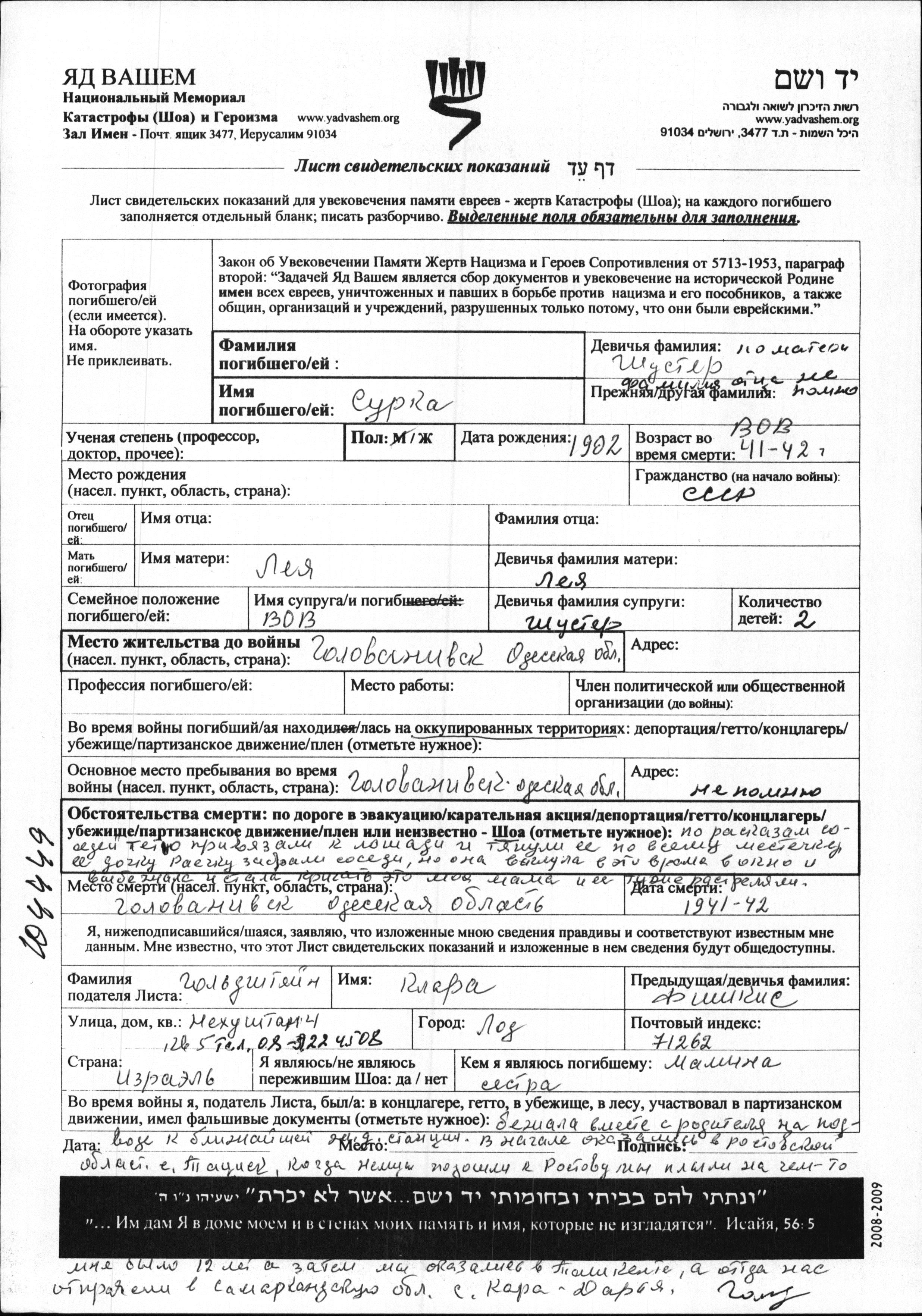 Surname unknown Surka 1902 Golovanevsk, Ukraine (USSR) Page of Testimony