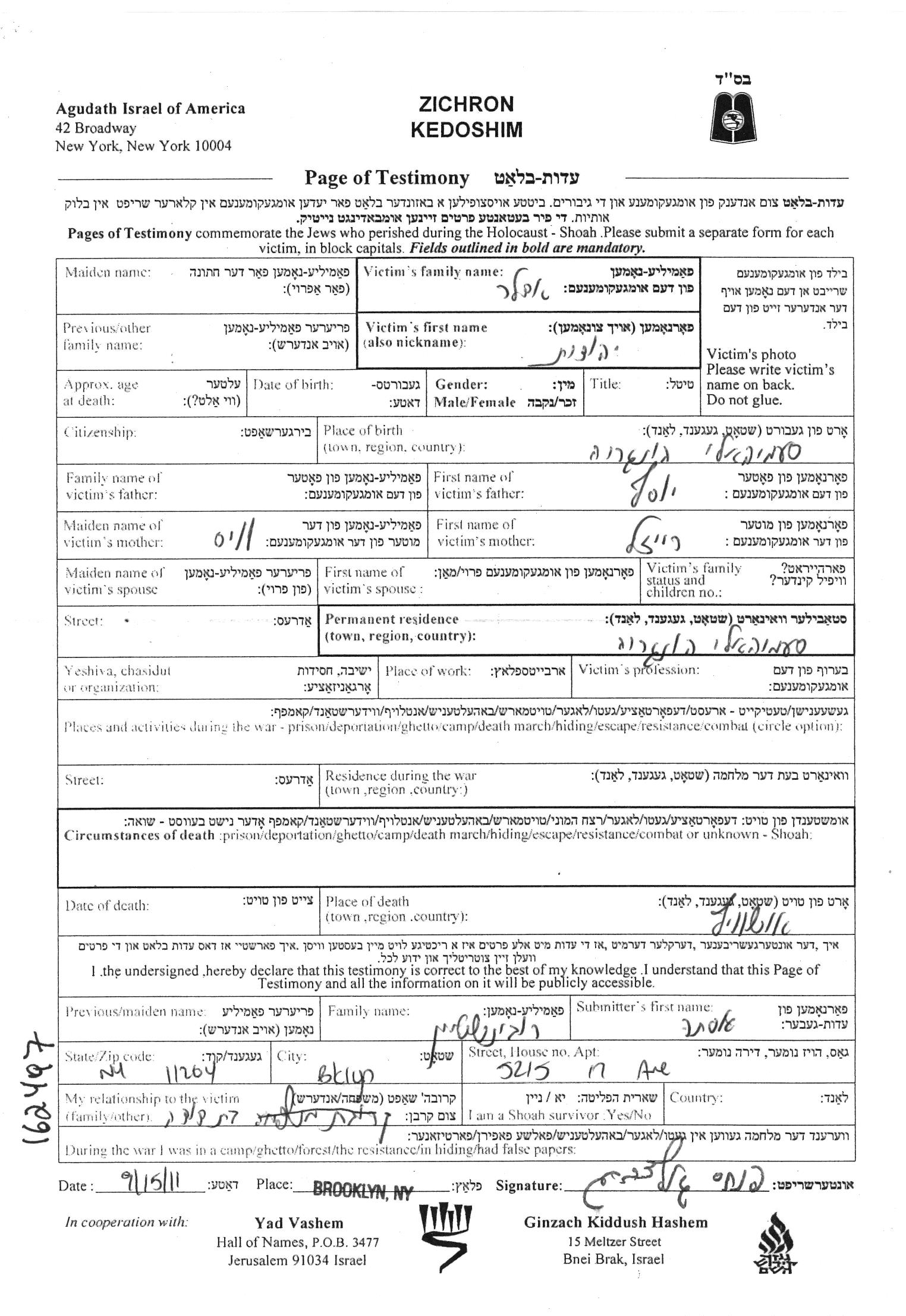 Yad Vashem - Pages of Testimony Names Memorial Collection