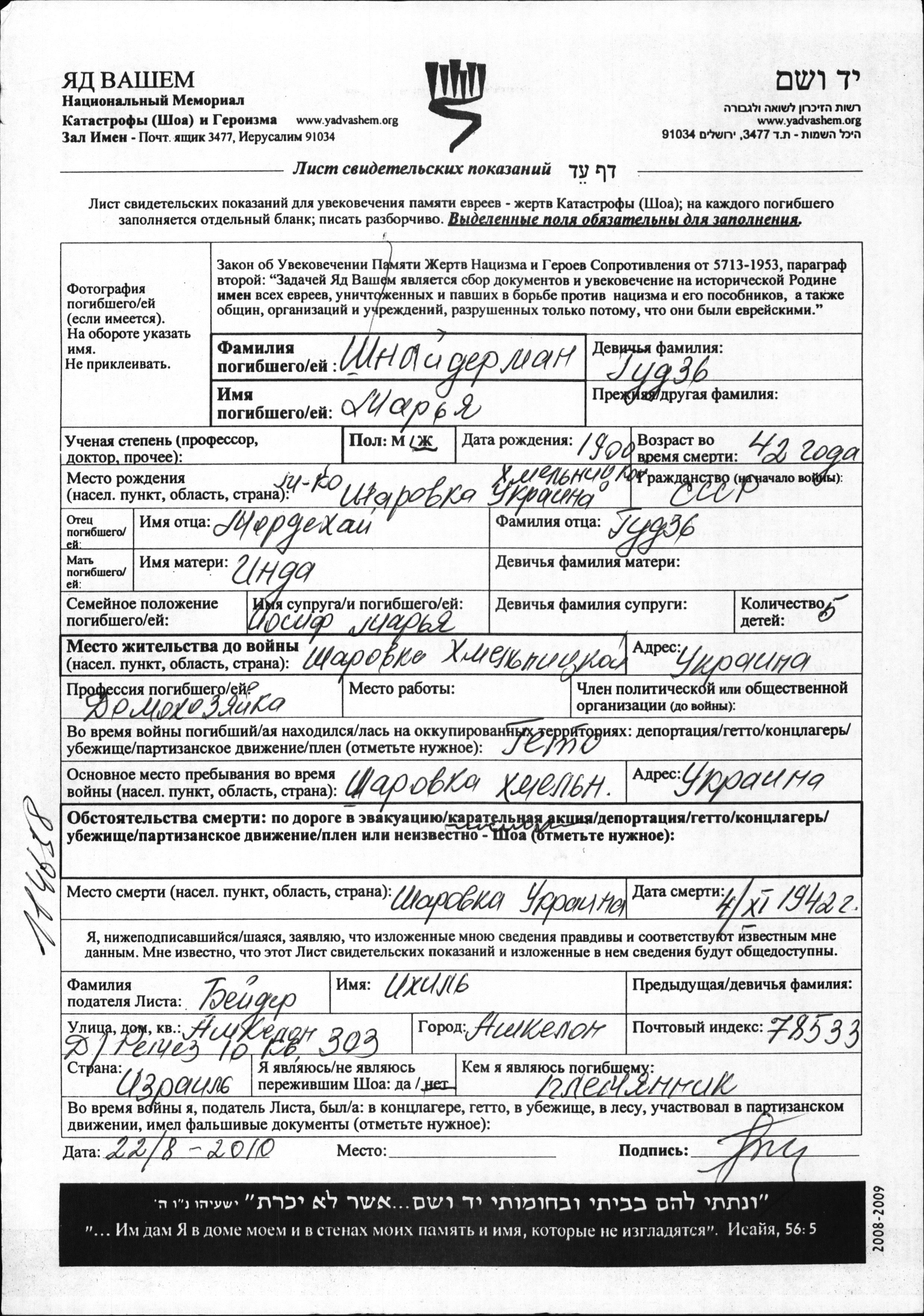 Shnaiderman Maria 1900 Sharovka, Ukraine (USSR) Page of Testimony