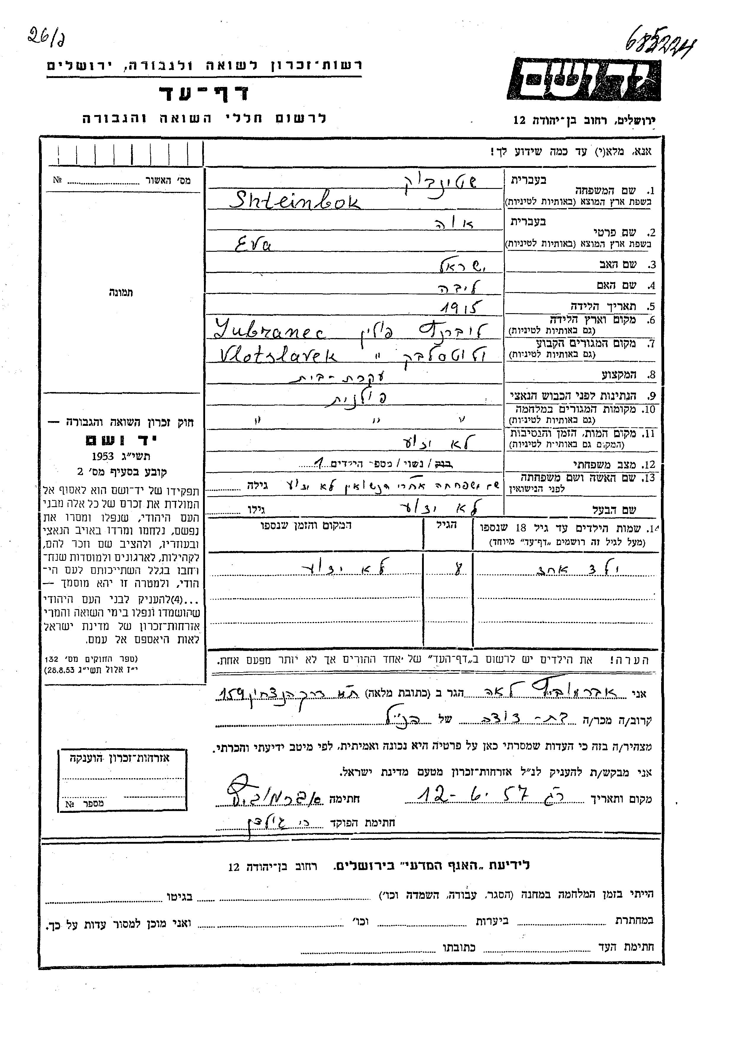 Eva Shteinbok nee Shteinbok was born in Lubraniec, Poland, 1915 to Yisrael and Liba. She was a housewife and married. Prior to WWII she lived in Vlotslavek, Poland. During the war she was in Vlotslavek, Poland. Eva was murdered in the Shoah.