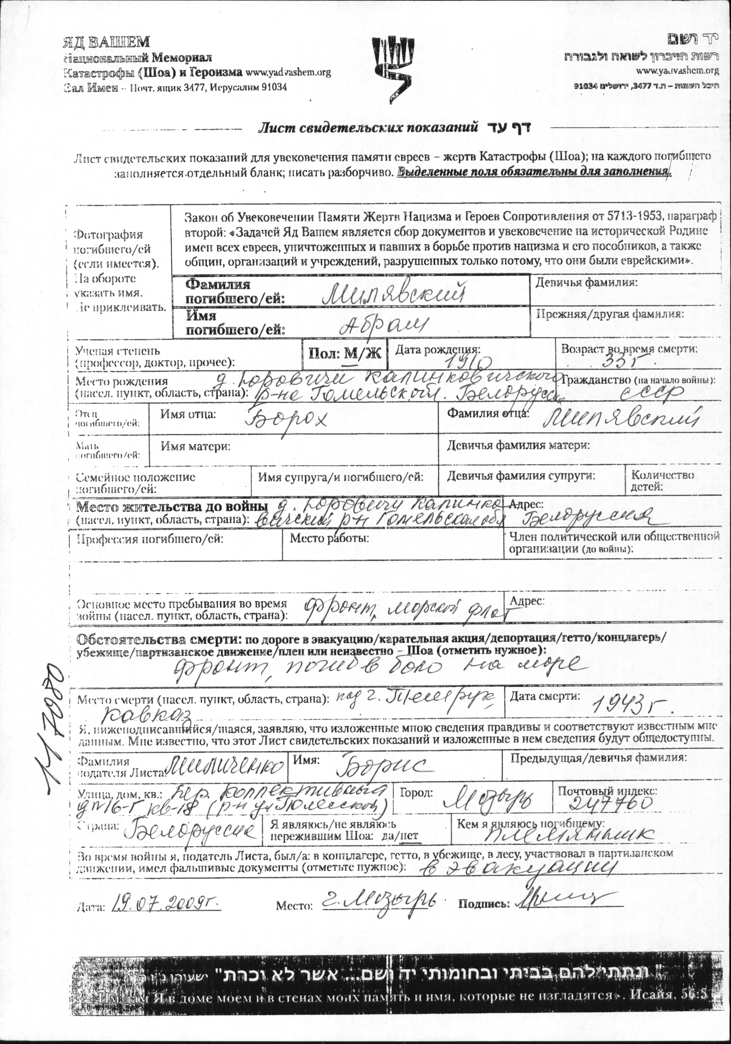 Abram Milyavski was born in Yurovichi, Belorussia (USSR), 1910 to Borokh. Prior to WWII he lived in Yurovichi, Belorussia (USSR). During the war he was in the Soviet armed forces. Abram was killed in military service in WWII. Place of death: Temryuk, Russia (USSR), 1943.