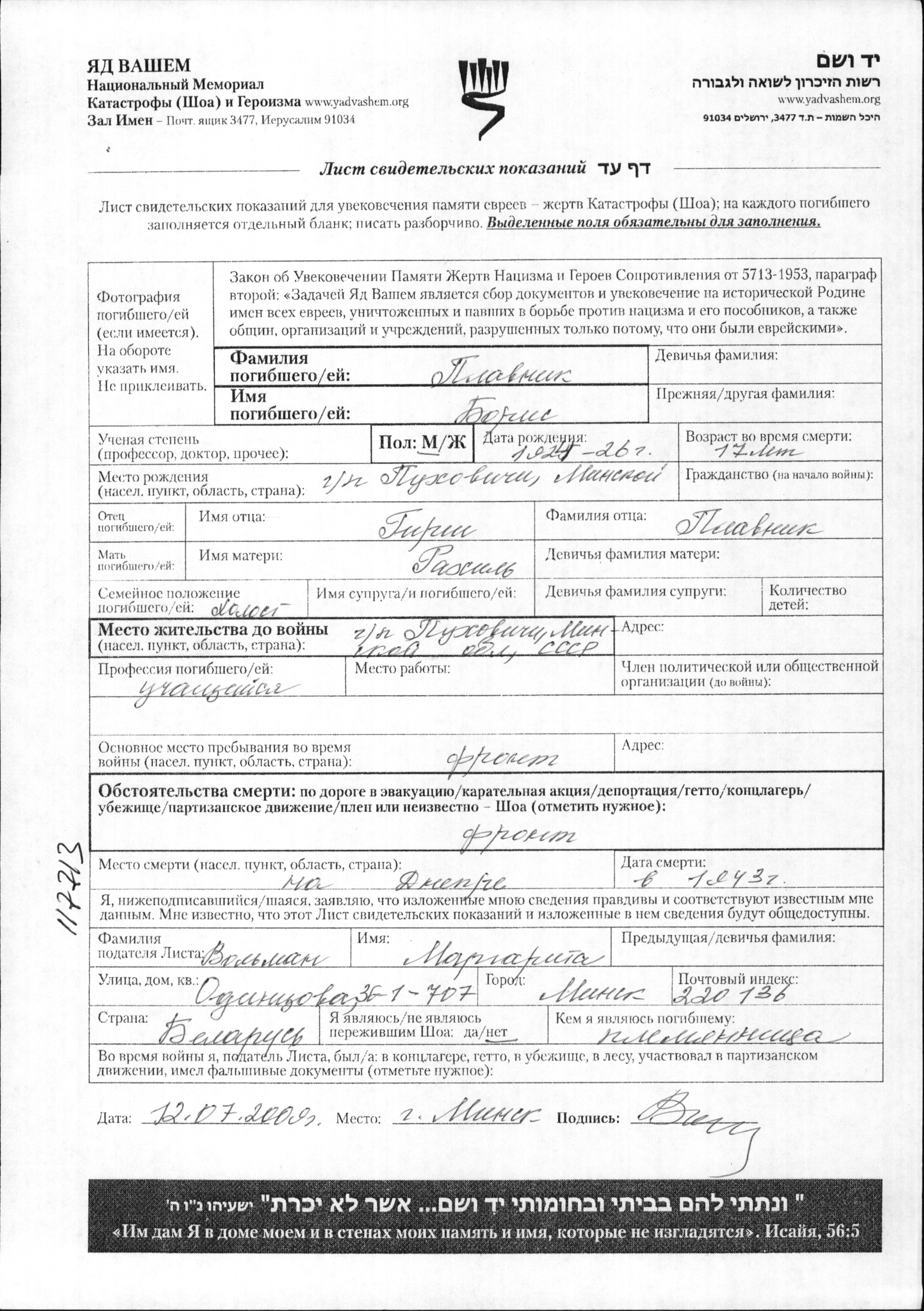 Boris Plavnik was born in Pukhovichi, Belorussia (USSR), 1925 to Girsh and Rakhil. He was a pupil and teenager. Prior to WWII he lived in Pukhovichi, Belorussia (USSR). During the war he was in the Soviet armed forces. Boris was killed in military service in WWII. Place of death: unknown, 1943.