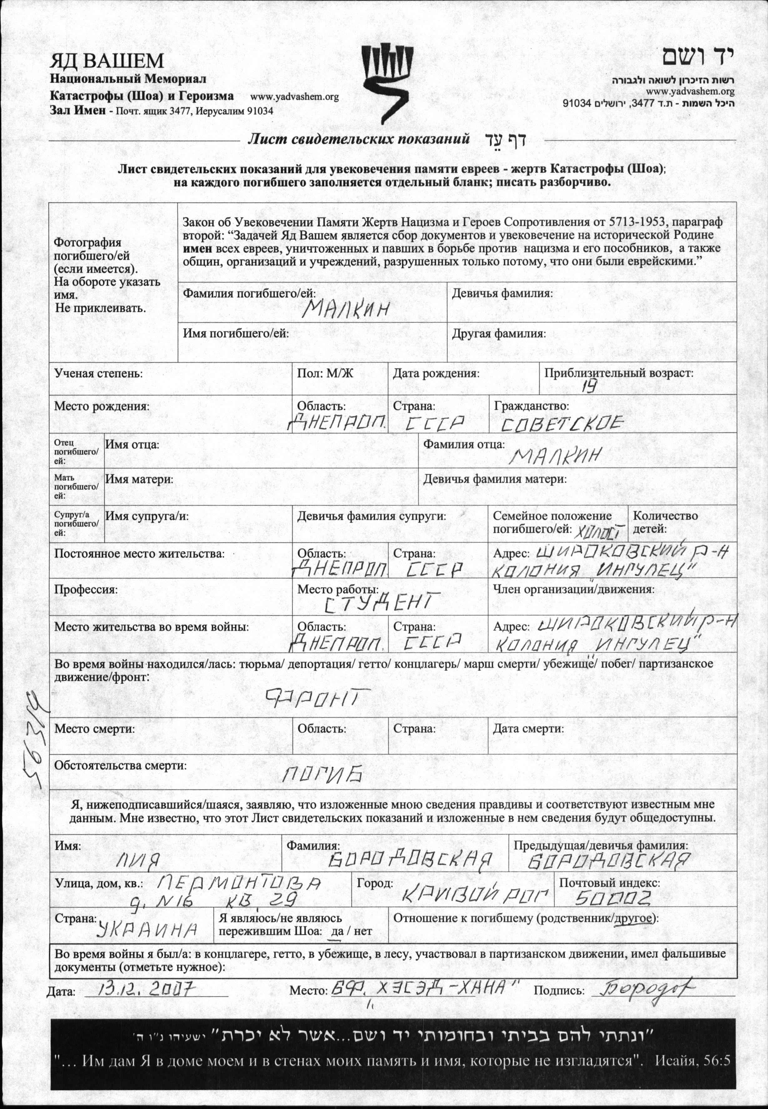 First name unknown Malkin was born in Dnepropetrovsk, Ukraine (USSR). He was a student and single. Prior to WWII he lived in Ingulets, Ukraine (USSR). During the war he was in the Soviet armed forces. He was killed in military service in WWII.