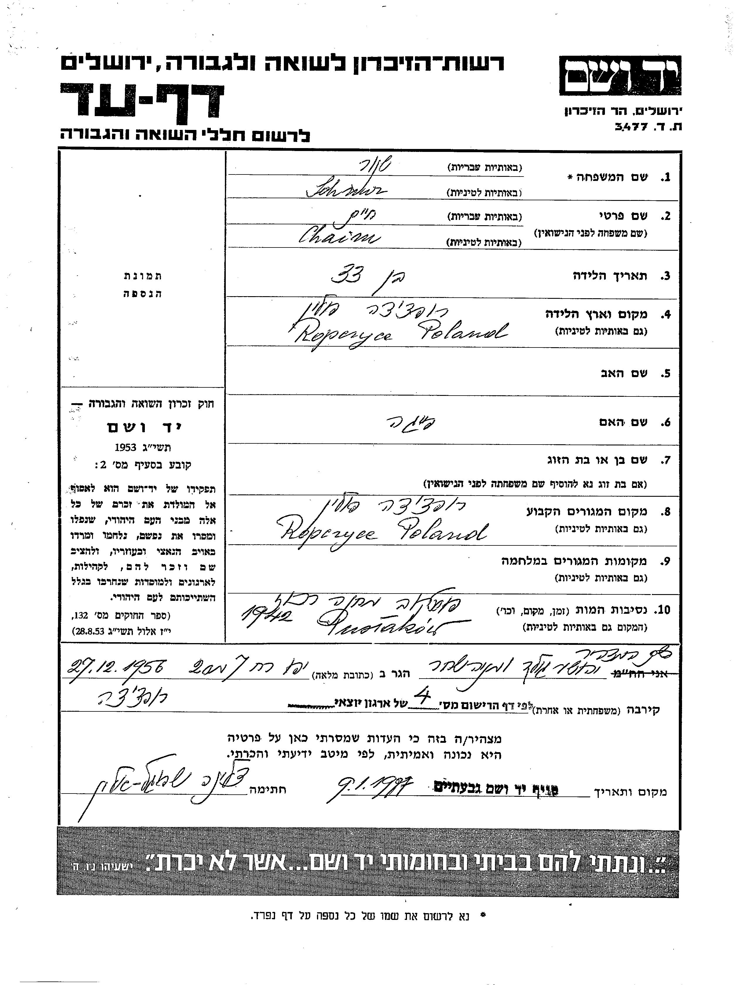 Yad Vashem - Pages of Testimony Names Memorial Collection