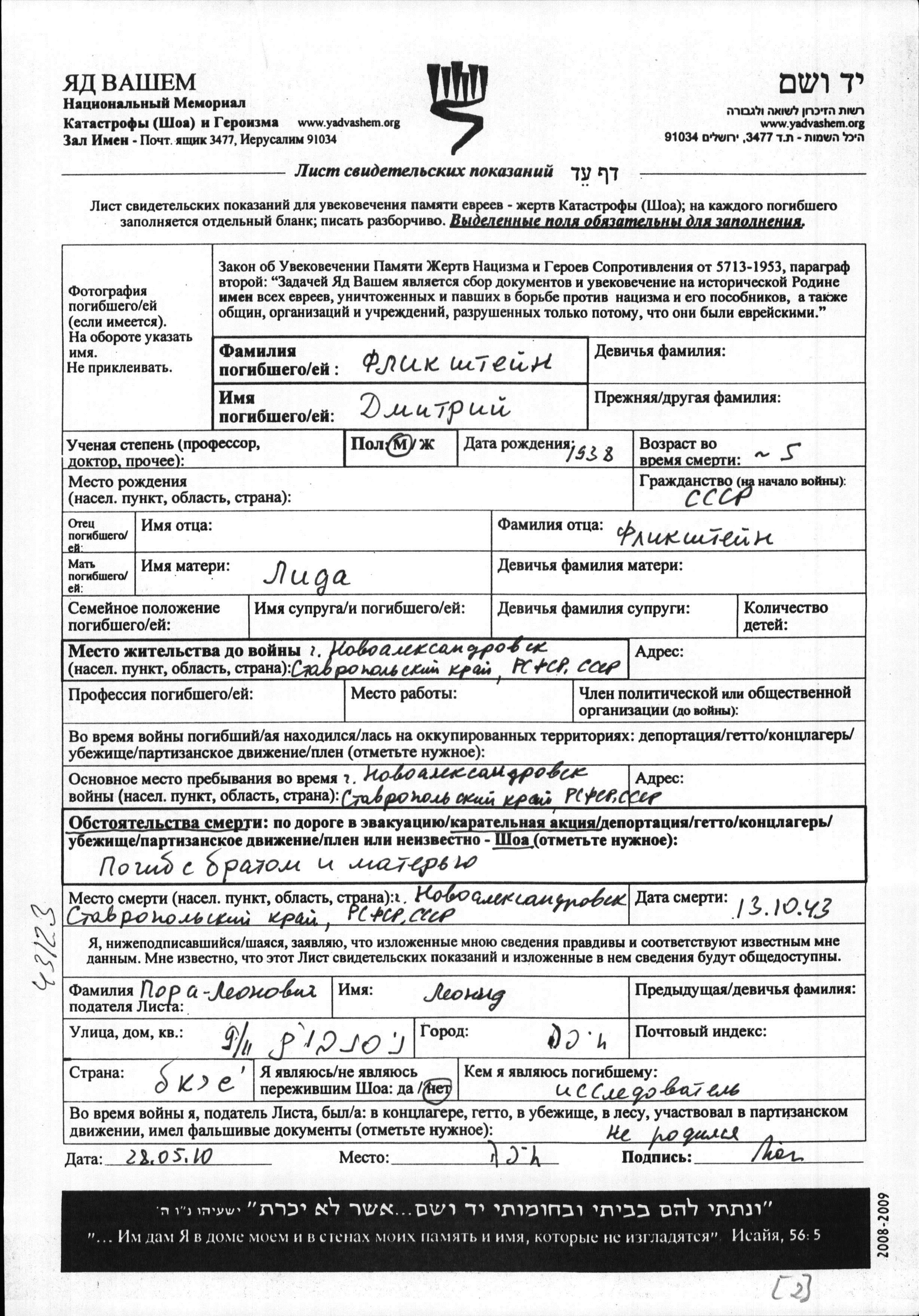 Dmitri Flikshtein was born, 1938 to Lida. Prior to WWII he lived in Novoaleksandrovsk, Russia (USSR). During the war he was in Novoaleksandrovsk, Russia (USSR). Dmitri was murdered in the Shoah. Place of death: Novoaleksandrovsk, Russia (USSR), 13/10/1943.