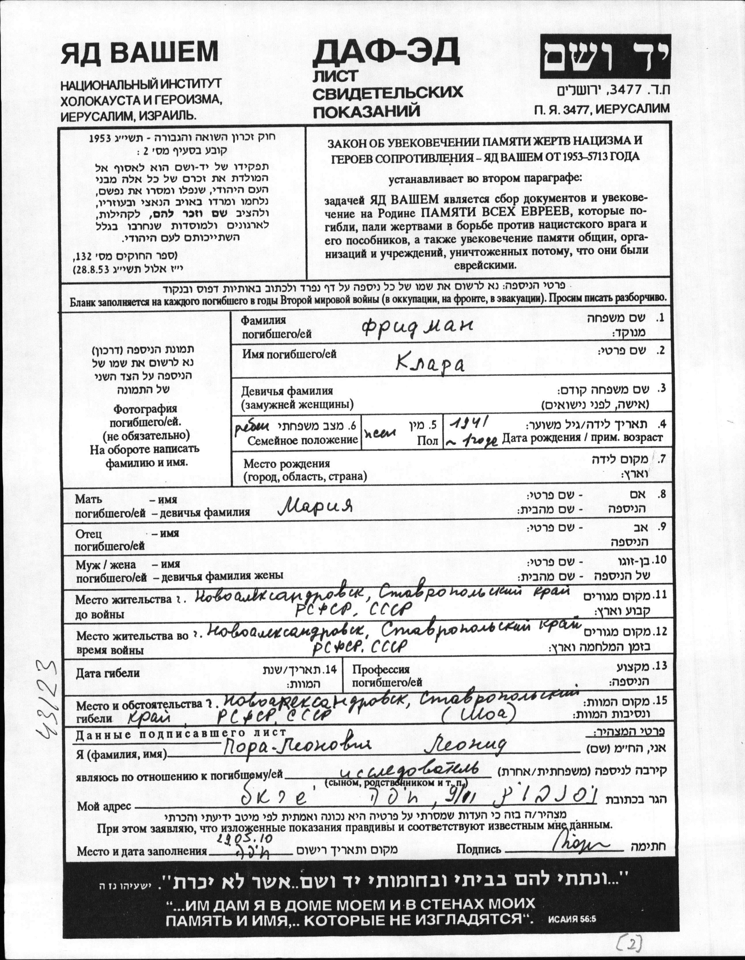 Klara Fridman was born, 1941 to Maria. She was child. Prior to WWII she lived in Novoaleksandrovsk, Russia (USSR). During the war she was in Novoaleksandrovsk, Russia (USSR). Klara was murdered in the Shoah. Place of death: Novoaleksandrovsk, Russia (USSR).