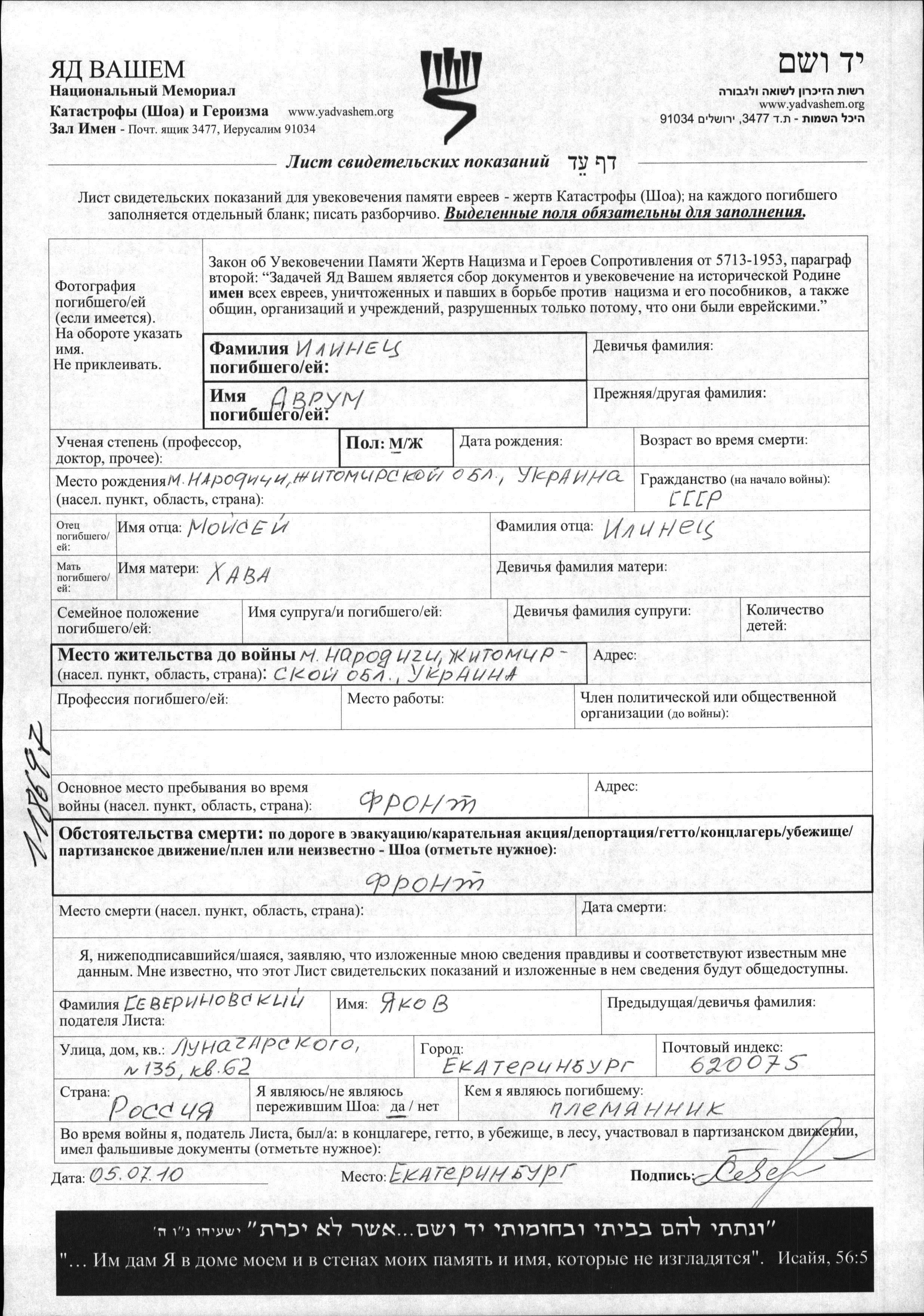 Avrum Ilinetz was born in Narodichi, Ukraine (USSR) to Moisey and Khava. Prior to WWII he lived in Narodichi, Ukraine (USSR). During the war he was in the Soviet armed forces. Avrum was killed in military service in WWII.