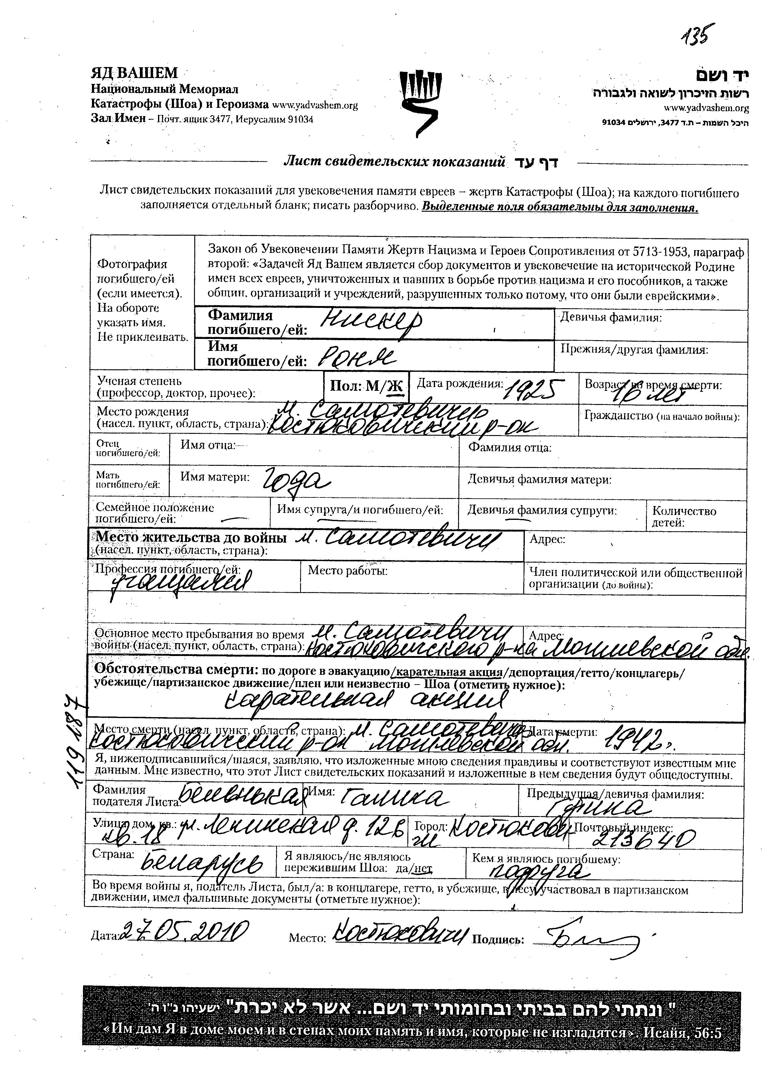 Yad Vashem - Pages of Testimony Names Memorial Collection