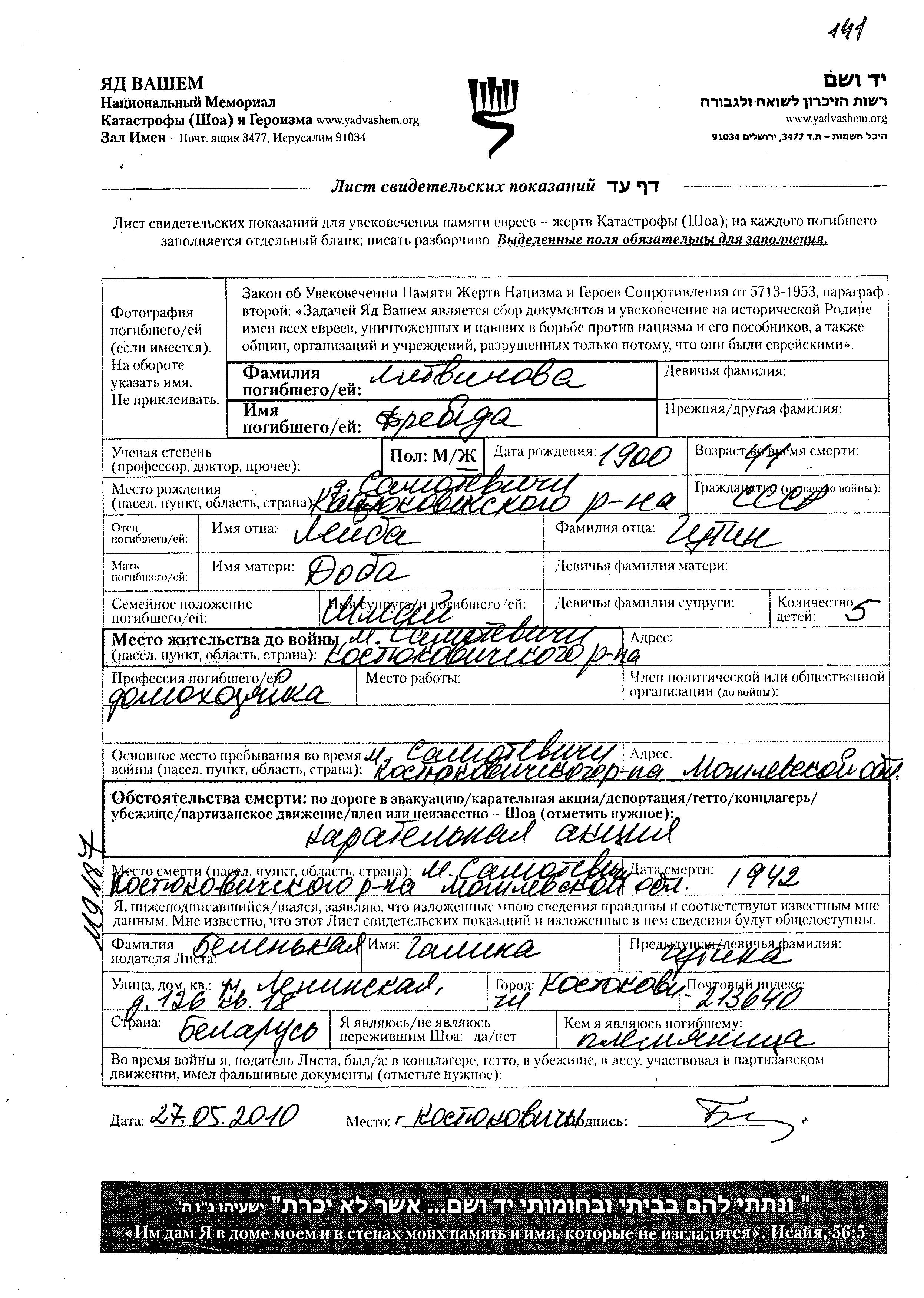 Litvinova Freyda 1900 Samotevichi, Belorussia (USSR) Page of Testimony