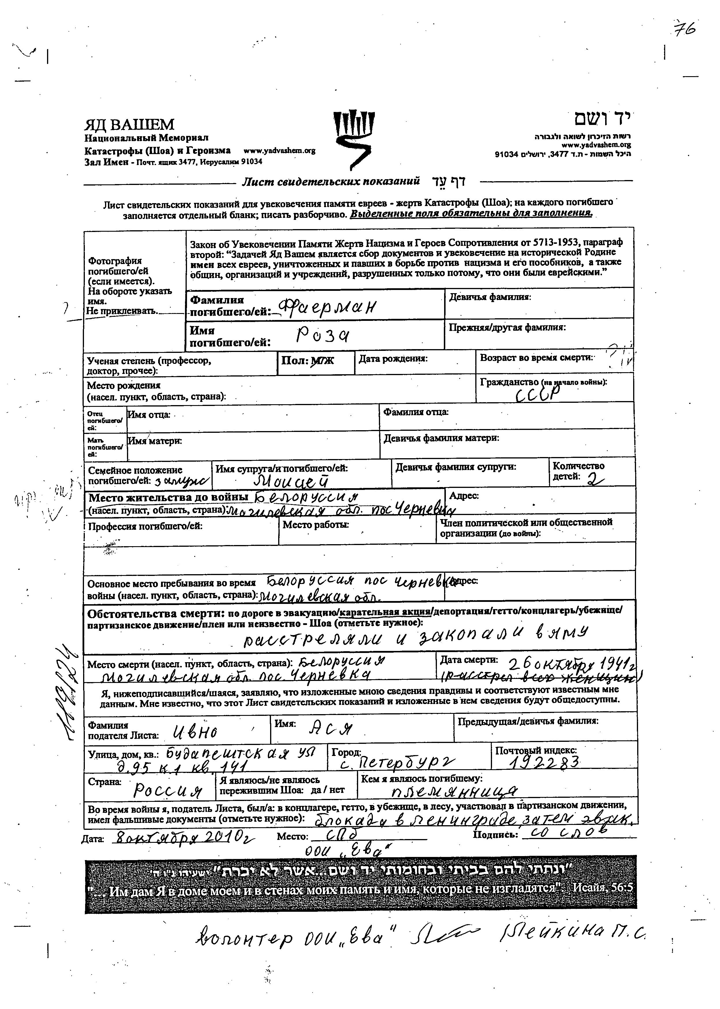 Roza Faerman. She was married to Moisei. Prior to WWII she lived in Chernevka, Belorussia (USSR). During the war she was in Chernevka, Belorussia (USSR). Roza was murdered in the Shoah. Place of death: Chernevka, Belorussia (USSR), 26/10/1941.