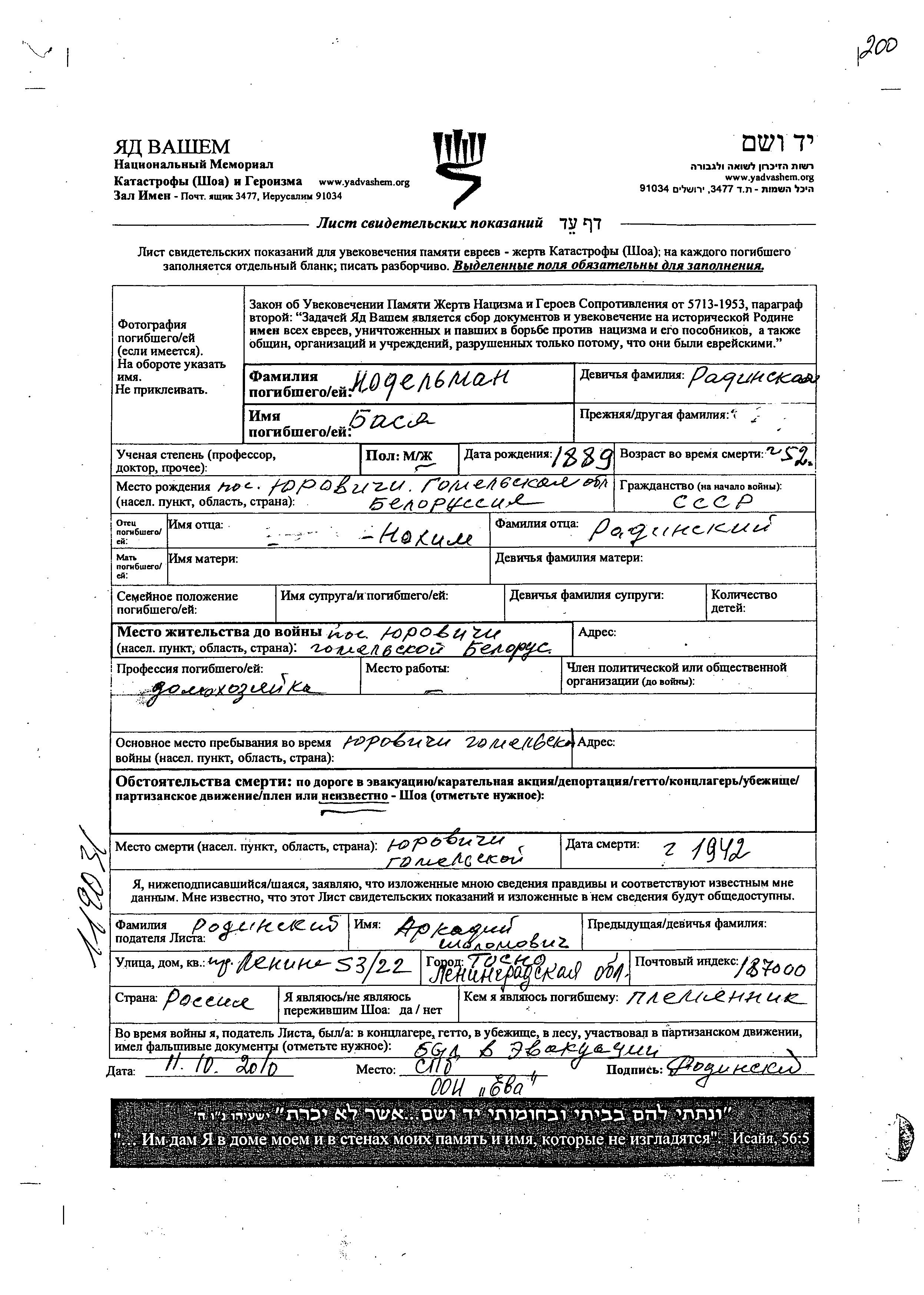 Nodelman Basya 1889 Yurovichi, Belorussia (USSR) Page of Testimony