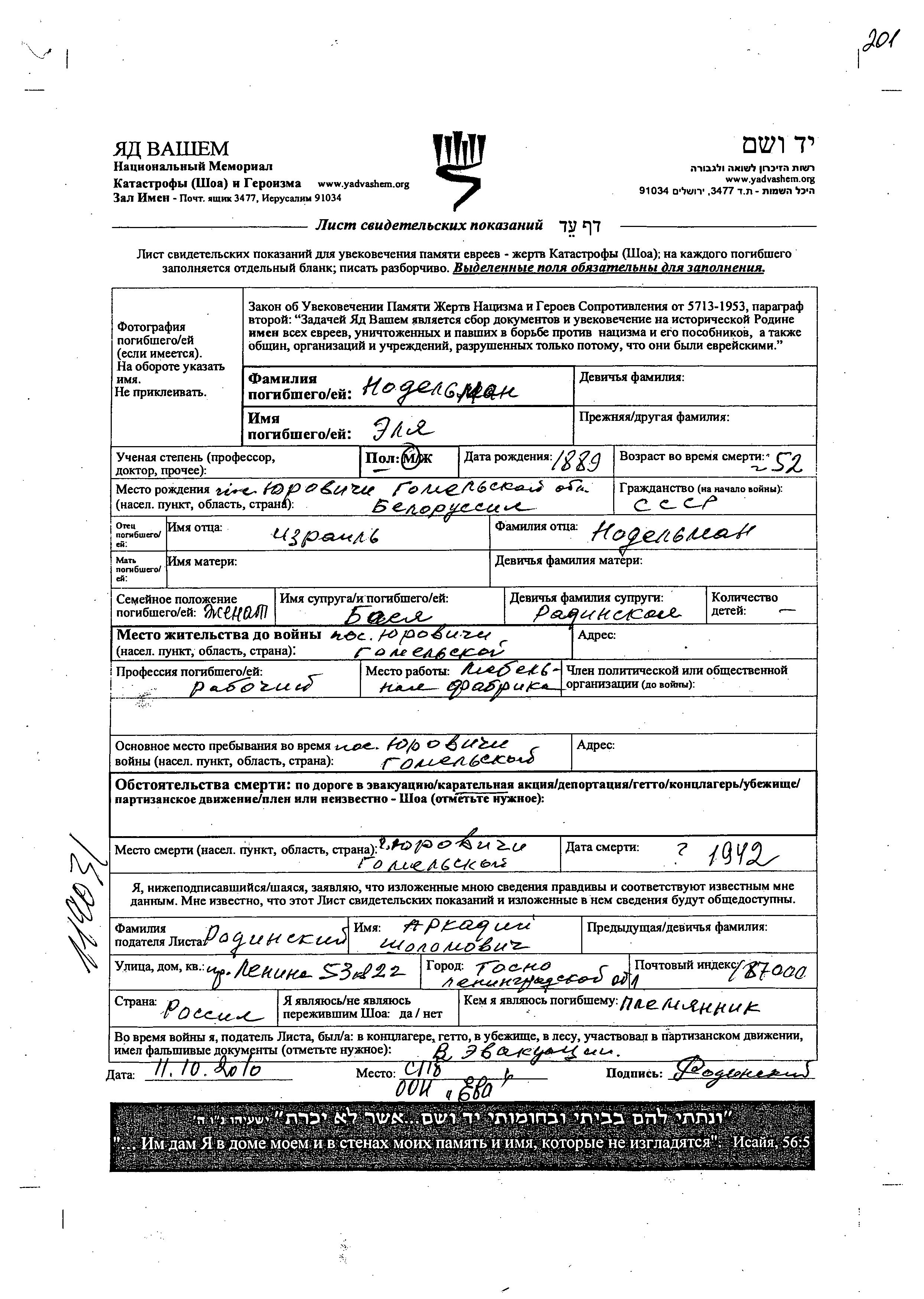 Nodelman Elya 1889 Yurovichi, Belorussia (USSR) Page of Testimony
