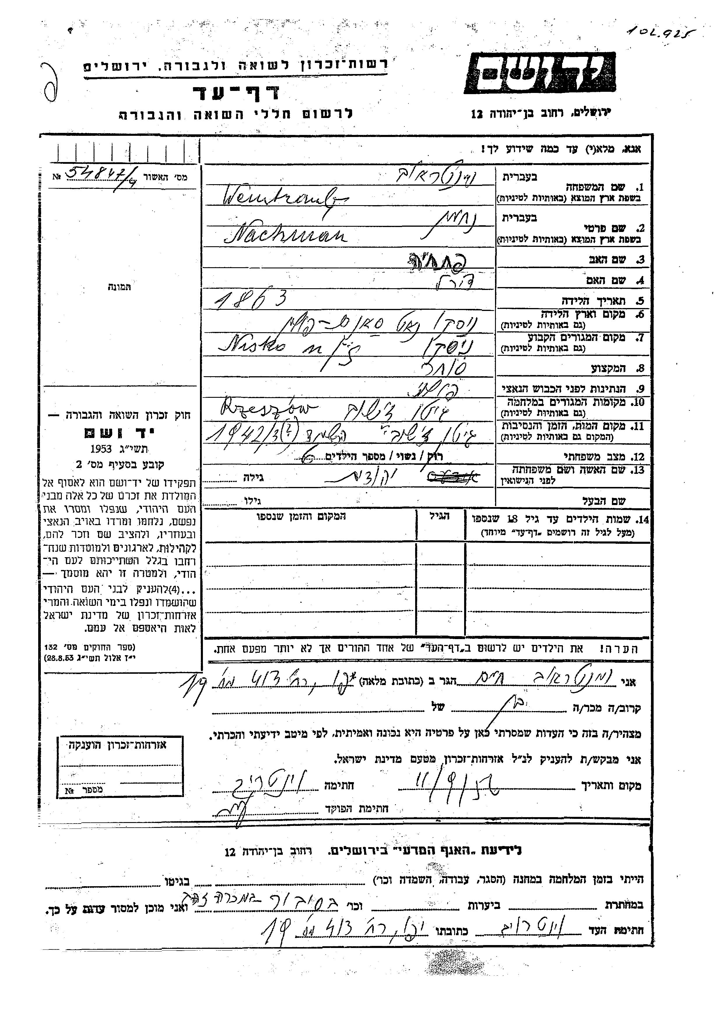Nachman Weintraub was born in Nisko, Poland, 1863 to Ptakhia and Tzirel. He was a merchant and married to Yehudit. Prior to WWII he lived in Nisko, Poland. During the war he was in Rzeszow, Poland. Nachman was murdered in the Shoah. Place of death: Rzeszow, Poland, 1942.