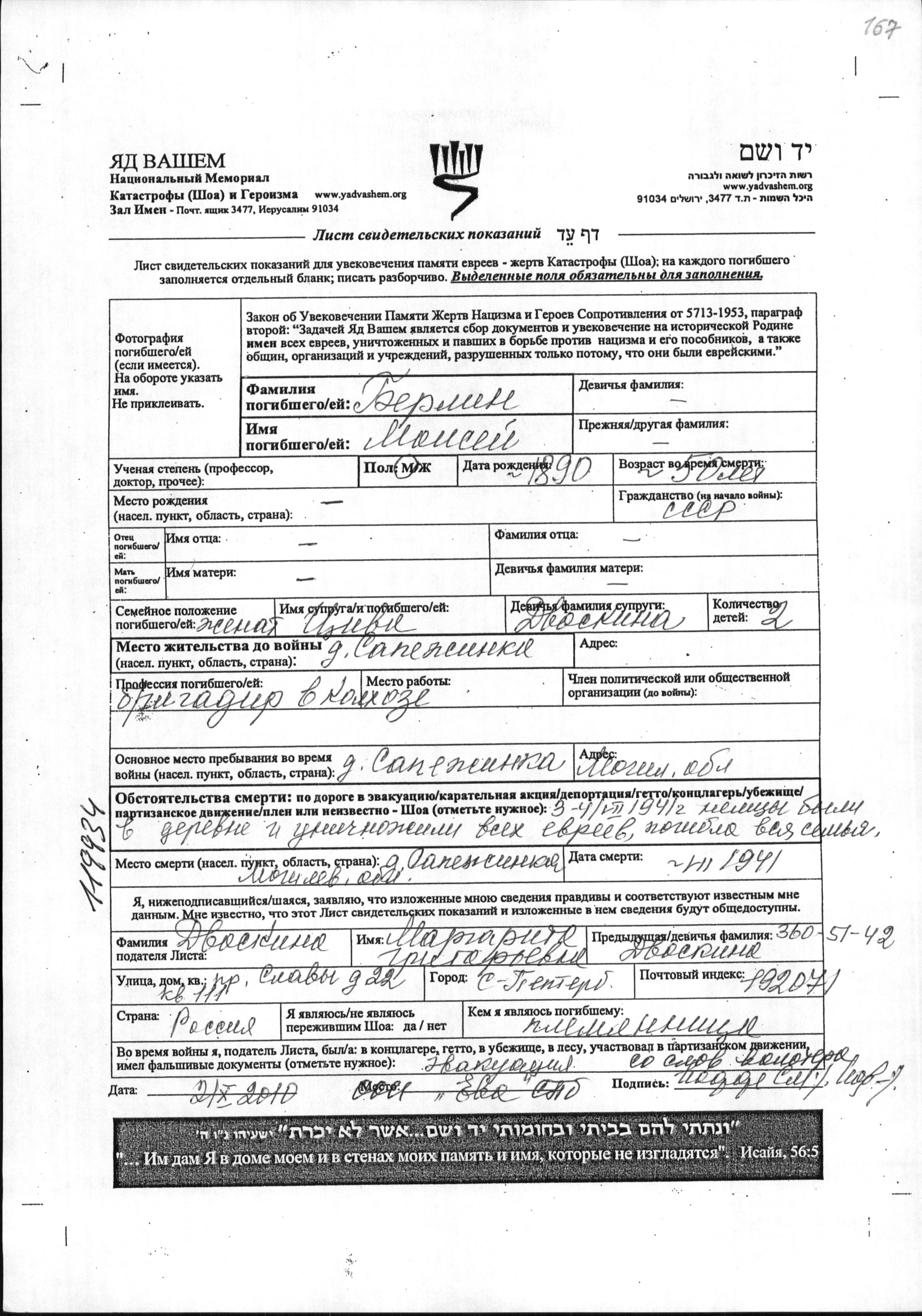 Moisey Berlin was born, 1890. He was a brigadir kolkhoznikov and married to Tzivya nee Dvoskina. Prior to WWII he lived in Sapezhinka, Belorussia (USSR). During the war he was in Sapezhinka, Belorussia (USSR). Moisey was murdered in the Shoah. Place of death: Sapezhinka, Belorussia (USSR), 07/1941.