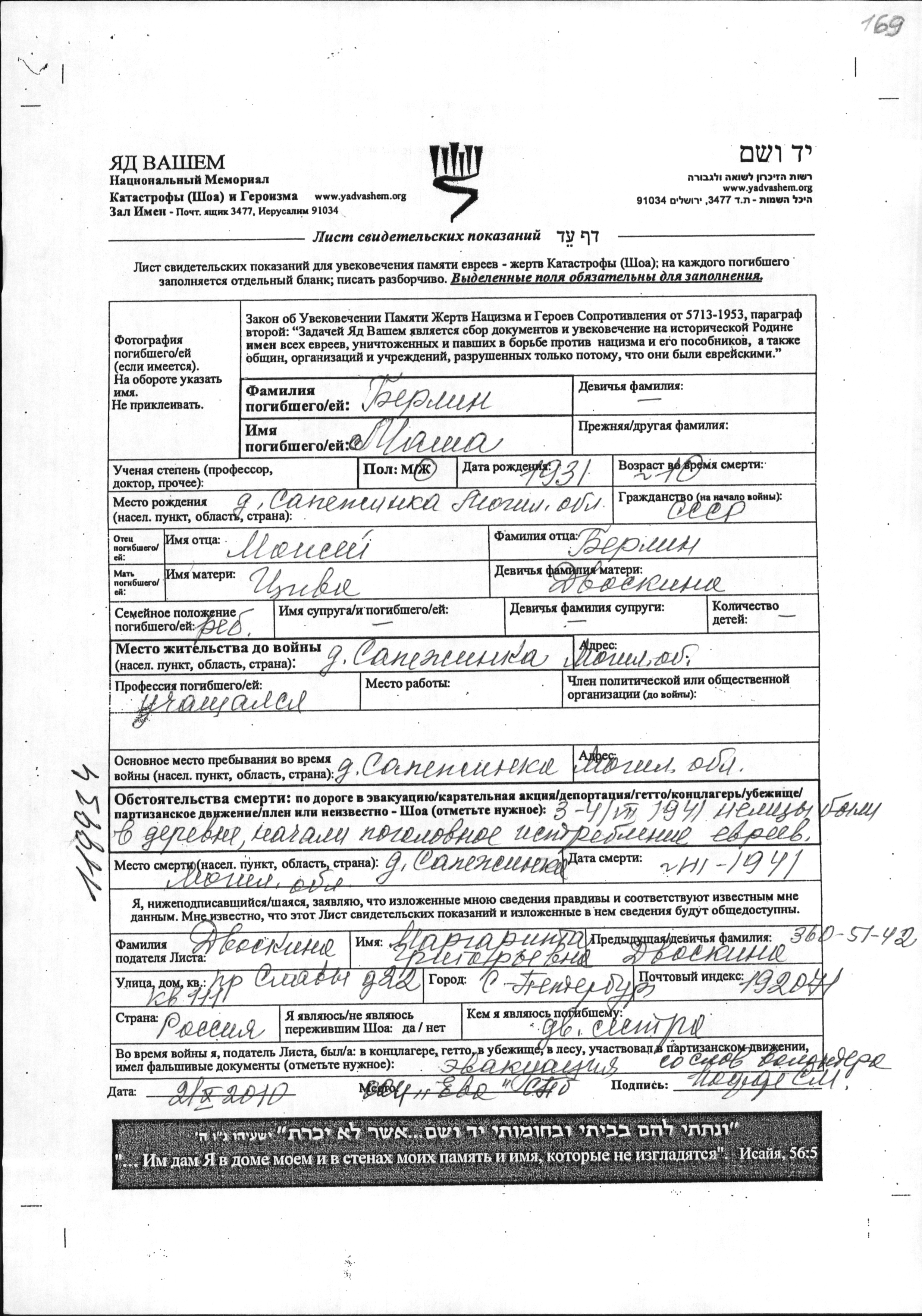 Masha Berlin was born in Sapezhinka, Belorussia (USSR), 1931 to Moisei and Tzivya nee Dvoskina. She was an uchashchayasya and child. Prior to WWII she lived in Sapezhinka, Belorussia (USSR). During the war she was in Sapezhinka, Belorussia (USSR). Masha was murdered in the Shoah. Place of death: Sapezhinka, Belorussia (USSR), 03/07/1941.