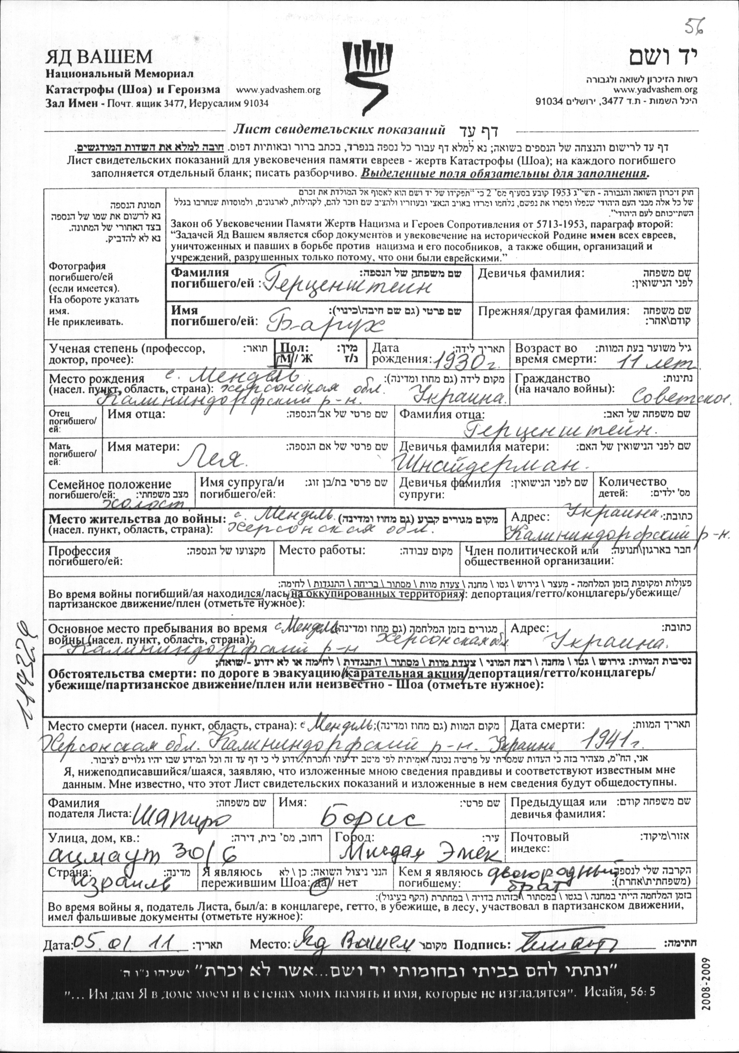 Barukh Gertzenshteyn was born in Mendeldorf, Ukraine (USSR), 1930 to Leya nee Shnayderman. He was child. Prior to WWII he lived in Mendeldorf, Ukraine (USSR). During the war he was in Mendeldorf, Ukraine (USSR). Barukh was murdered in the Shoah. Place of death: Mendeldorf, Ukraine (USSR), 1941.