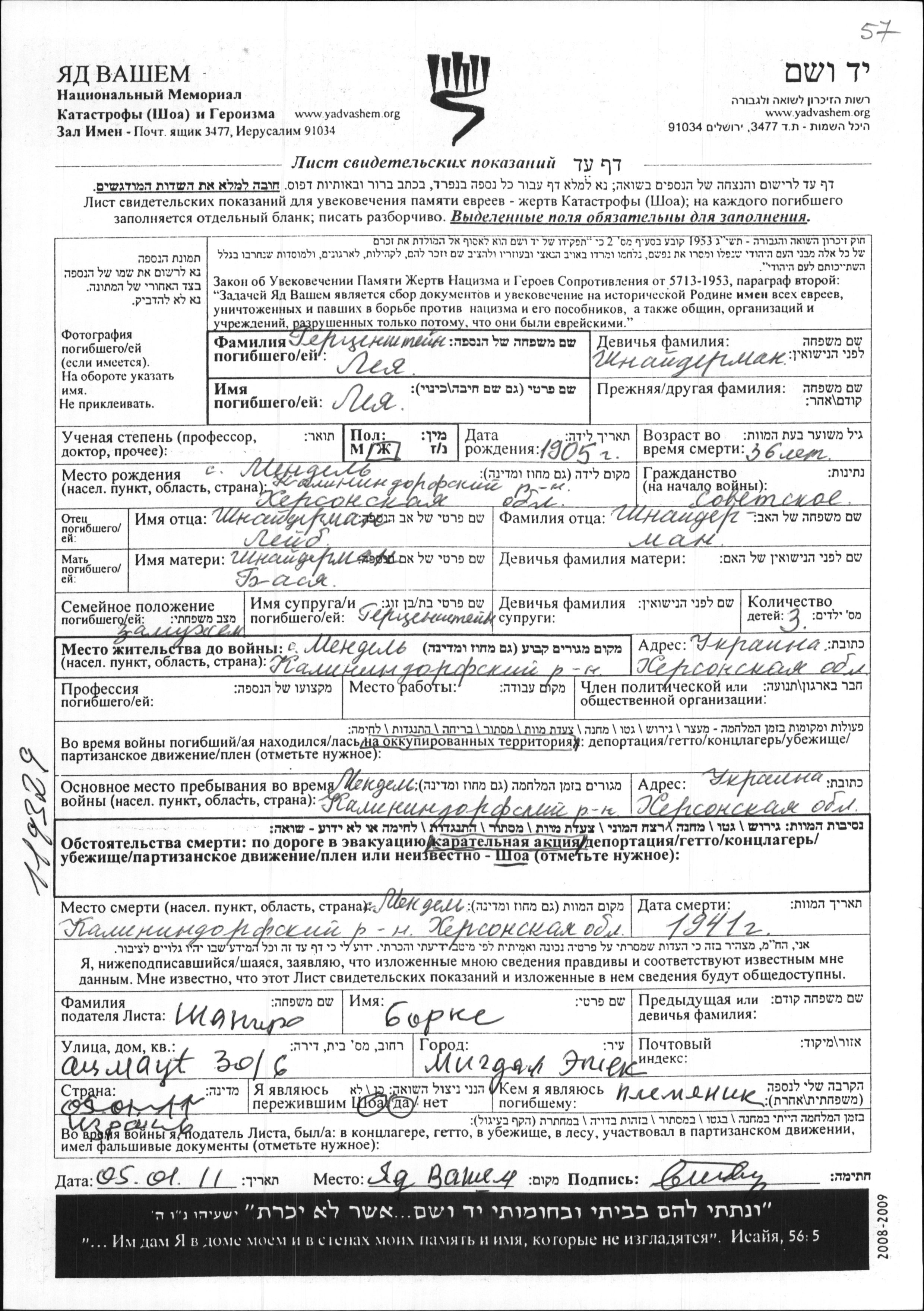Leya Gertzenshteyn nee Shnayderman was born in Mendeldorf, Ukraine (USSR), 1905 to Leyb and Basya. She was married. Prior to WWII she lived in Mendeldorf, Ukraine (USSR). During the war she was in Mendeldorf, Ukraine (USSR). Leya was murdered in the Shoah. Place of death: Mendeldorf, Ukraine (USSR), 1941.
