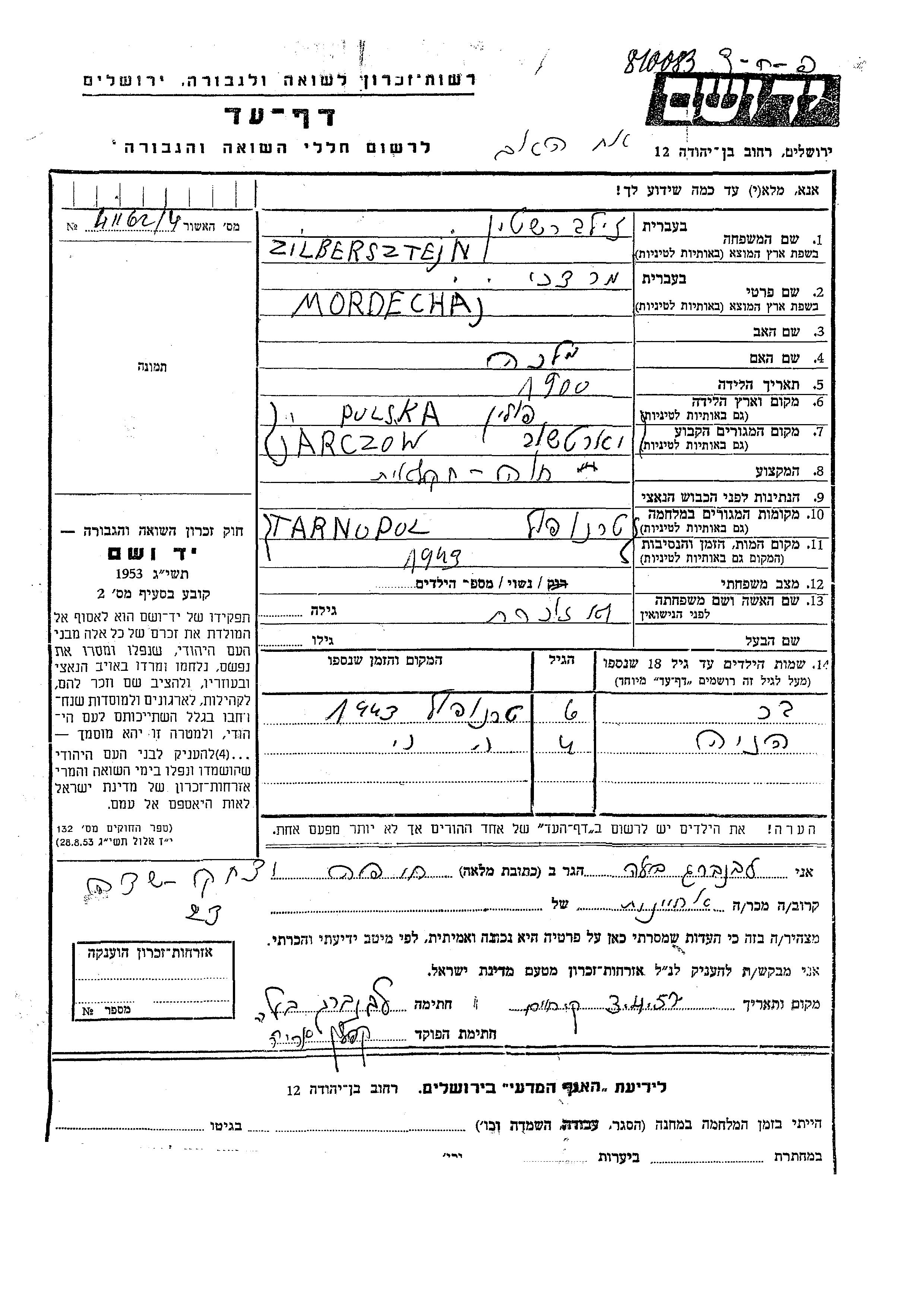 Mordechaj Zilbersztejn was born in Jarczow, Poland, 1900 to Malka. He was married. Prior to WWII he lived in Jarczow, Poland. During the war he was in Tarnopol, Poland. Mordechaj was murdered in the Shoah. Place of death: Tarnopol, Poland, 1943.