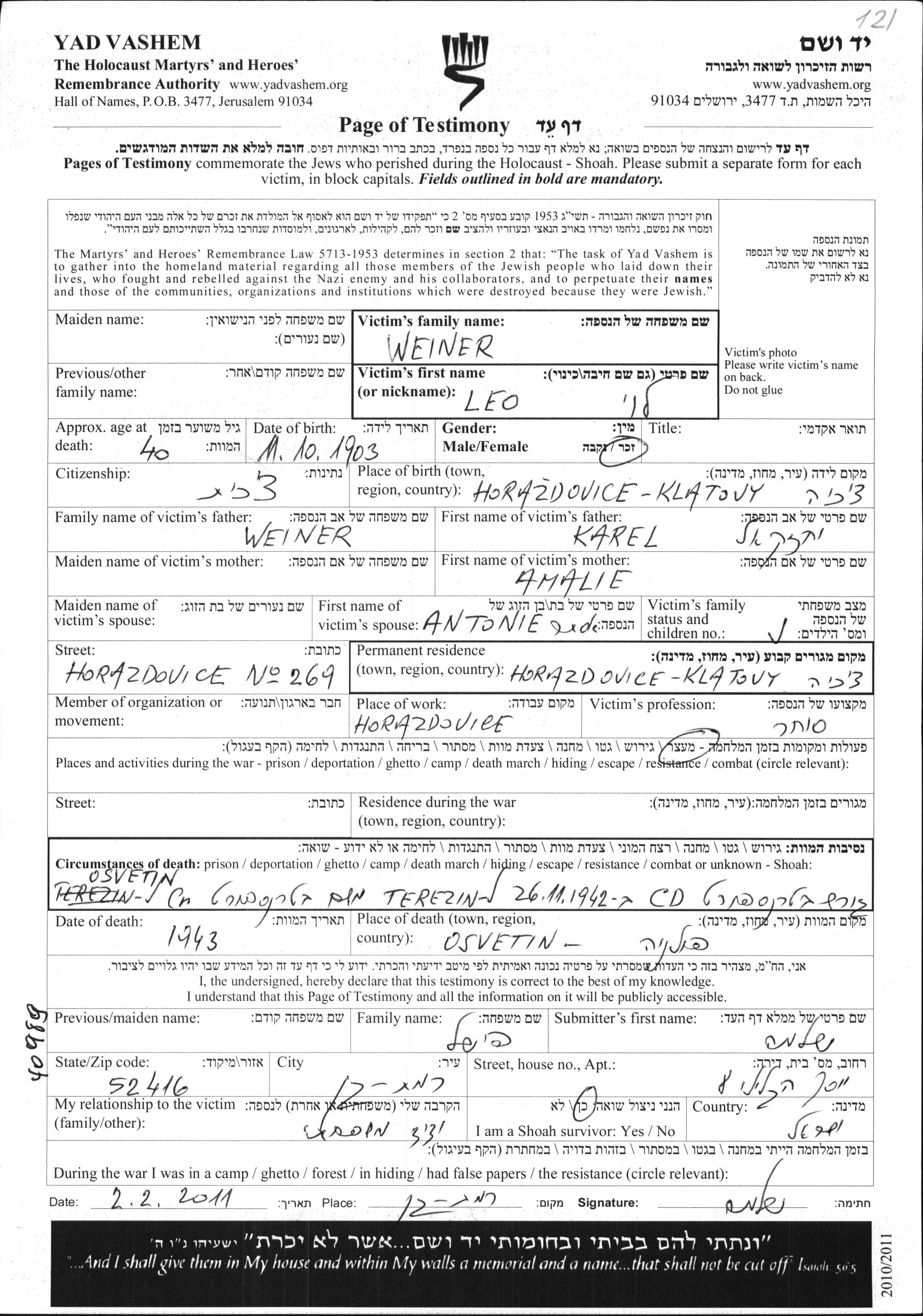Weiner Leo Levi 1903 Horazdovice, Czechoslovakia Page of Testimony