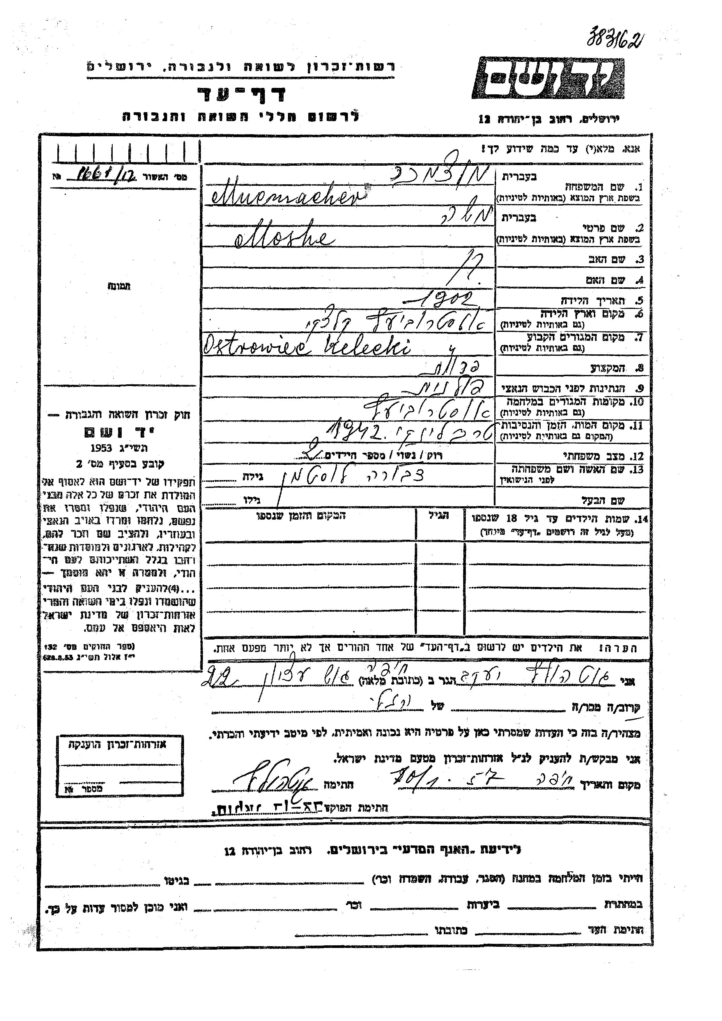 Moshe Mucmacher was born in Ostrowiec, Poland, 1902. He was a furrier and married to Dvora nee Lustman. Prior to WWII he lived in Ostrowiec, Poland. During the war he was in Ostrowiec, Poland. Moshe was murdered in the Shoah. Place of death: Treblinka, Poland, 1942.