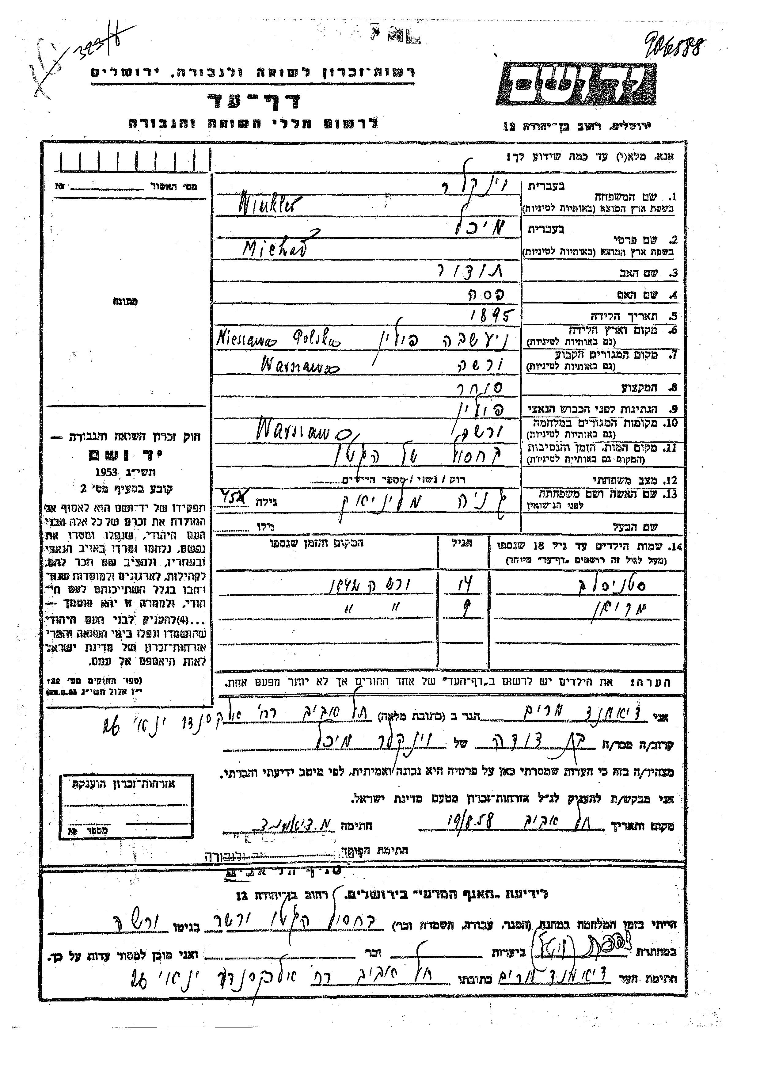Michel Winkler was born in Nieszawa, Poland, 1895 to Todor and Pesa. He was a merchant and married to Genya nee Maliniak. Prior to WWII he lived in Warsaw, Poland. During the war he was in Warsaw, Poland. Michel was murdered in the Shoah. Place of death: Warsaw, Poland.