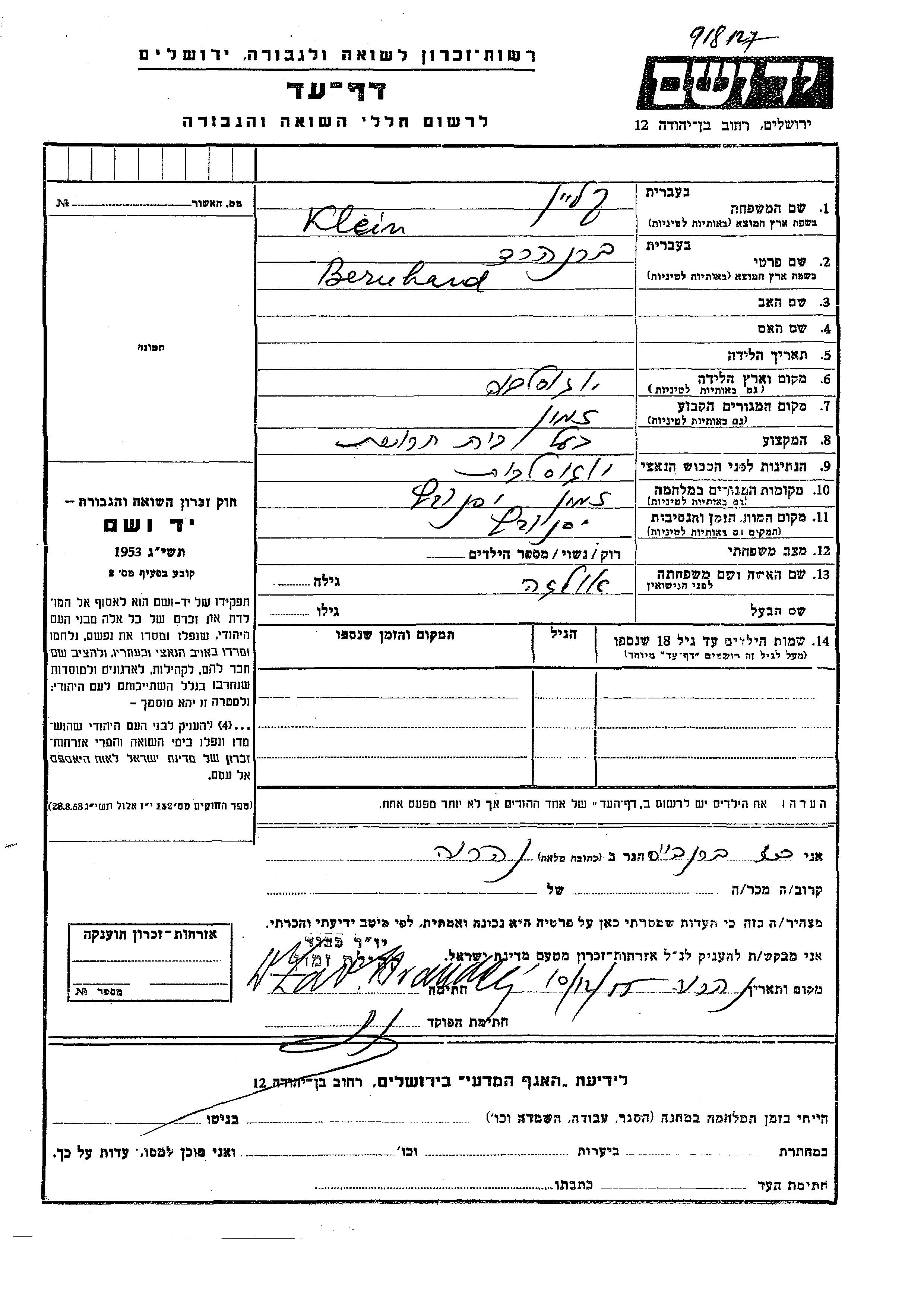 Klein Bernhard Zemun, Yugoslavia Page of Testimony