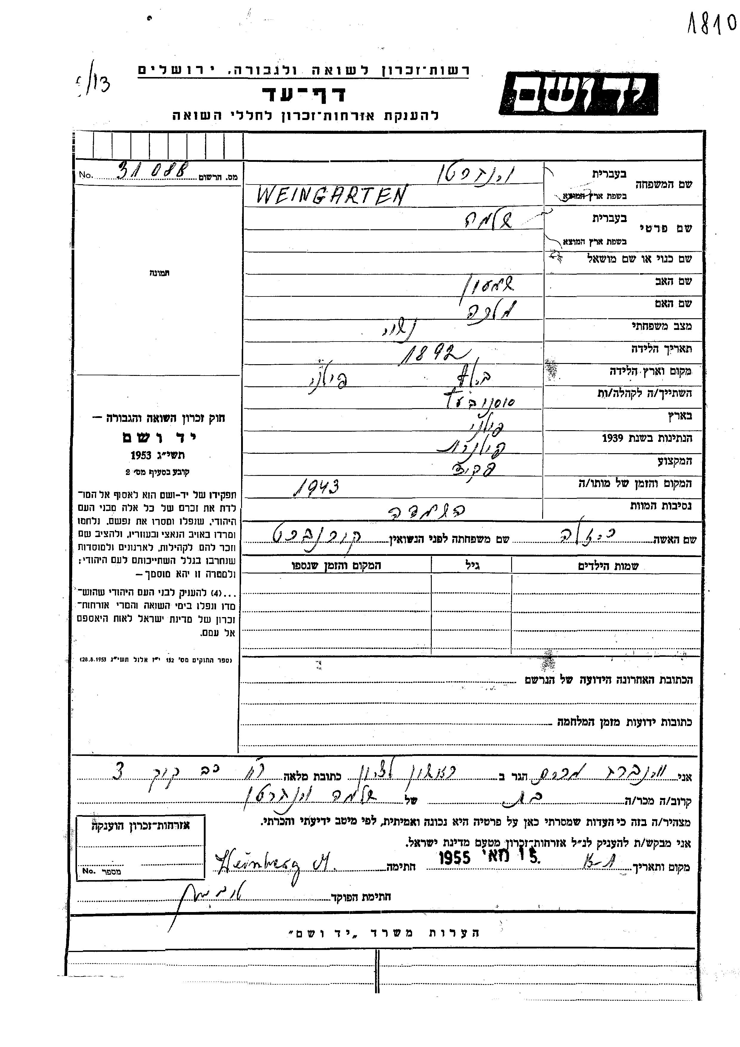 Weingarten Shlomo 1892 Sosnowic, Poland Page of Testimony