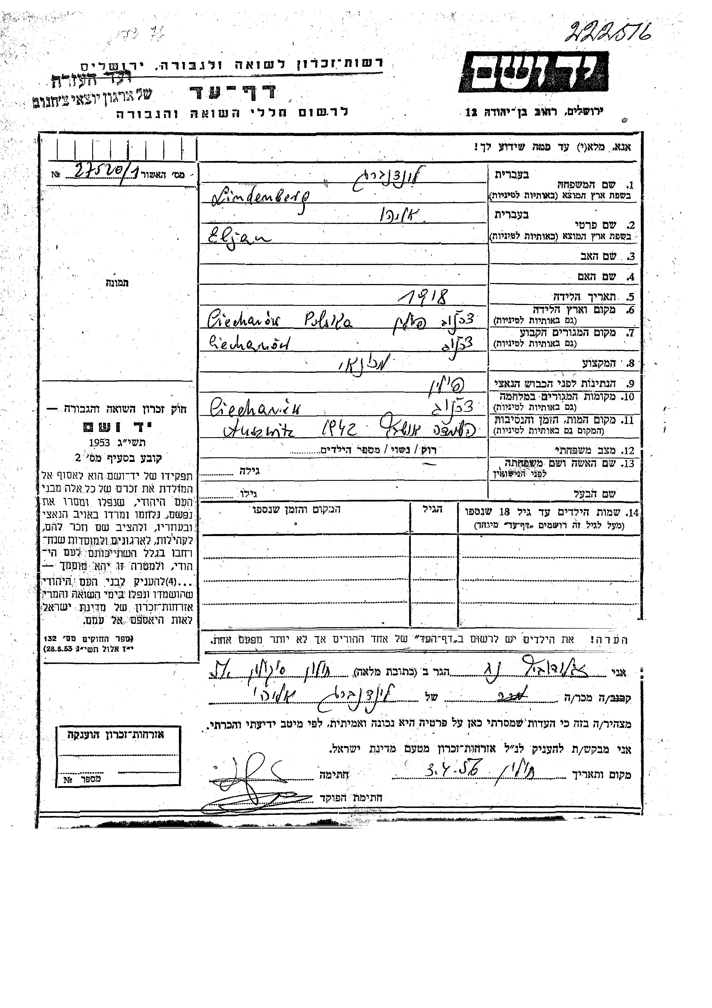 Eljau Lindenberg was born in Ciechanow, Poland, 1918. He was a mechanic and single. Prior to WWII he lived in Ciechanow, Poland. During the war he was in Ciechanow, Poland. Eljau was murdered in the Shoah. Place of death: Auschwitz, Poland, 1942.