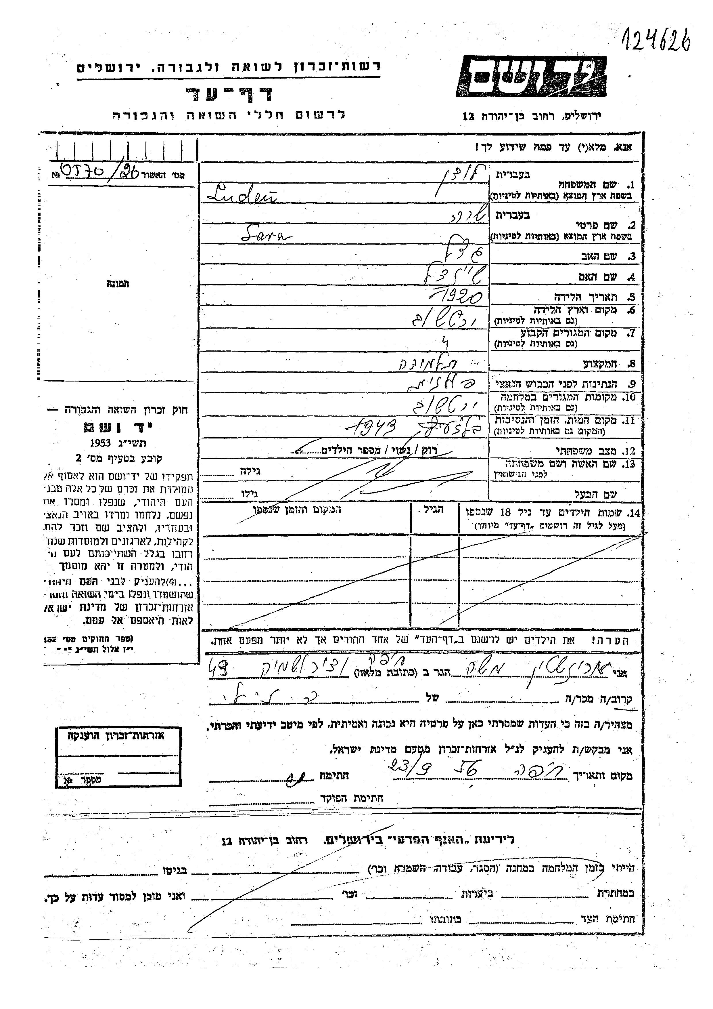 Sara Luden was born in Jarczow, Poland, 1920 to Getzel and Sheindl. She was a pupil and single. Prior to WWII she lived in Jarczow, Poland. During the war she was in Jarczow, Poland. Sara was murdered in the Shoah. Place of death: Belzec, Poland, 1943.