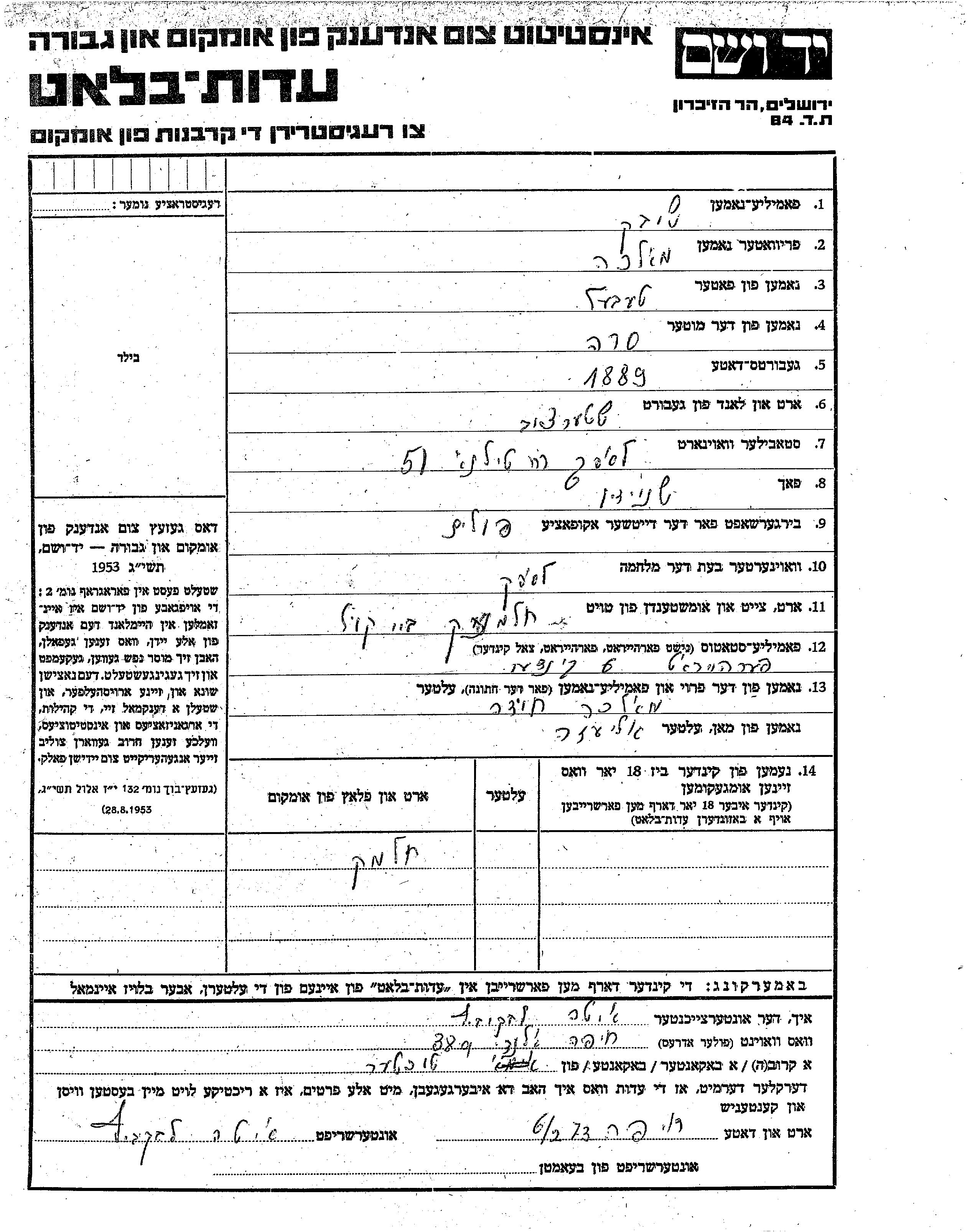 Malka Shibek nee Kheider was born in Szczercow, Poland, 1889 to Tevel and Sara. She was a tailor and married to Eliezer. Prior to WWII she lived in Lask, Poland. During the war she was in Lask, Poland. Malka was murdered in the Shoah. Place of death: Chelmno, Poland.