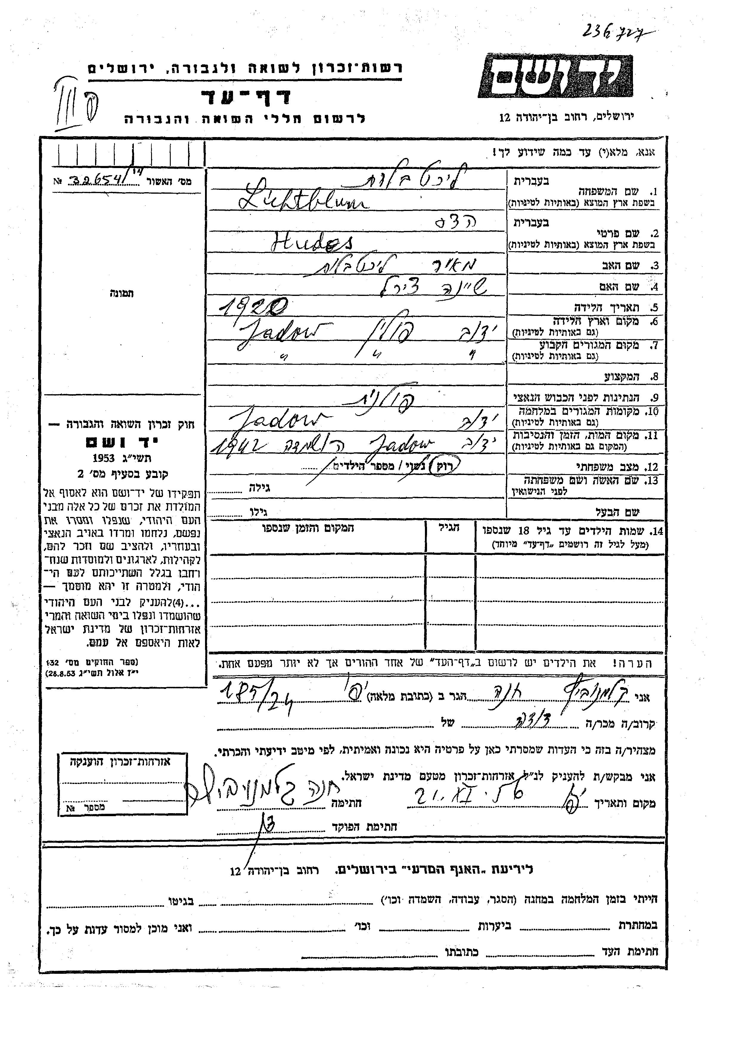 Hadas Lichtblum was born in Jadow, Poland, 1920 to Meir and Sheina Tzirel. She was single. Prior to WWII she lived in Jadow, Poland. During the war she was in Jadow, Poland. Hadas was murdered in the Shoah. Place of death: Jadow, Poland, 1942.