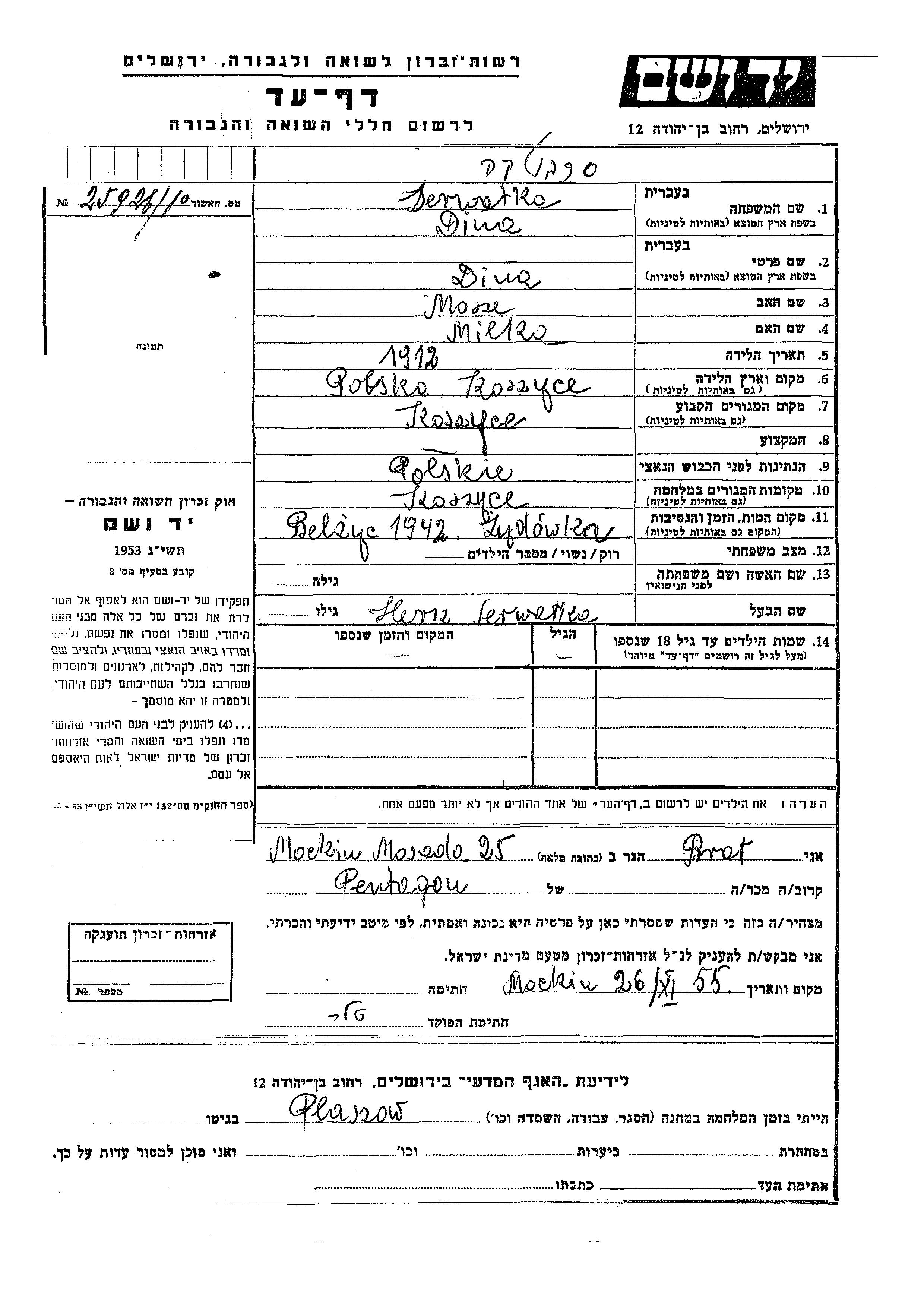 Dina Serwetka was born in Koszyce, Poland, 1912 to Mosze and Milka. She was married to Hersz. Prior to WWII she lived in Koszyce, Poland. During the war she was in Koszyce, Poland. Dina was murdered in the Shoah. Place of death: Belzec, Poland, 1942.