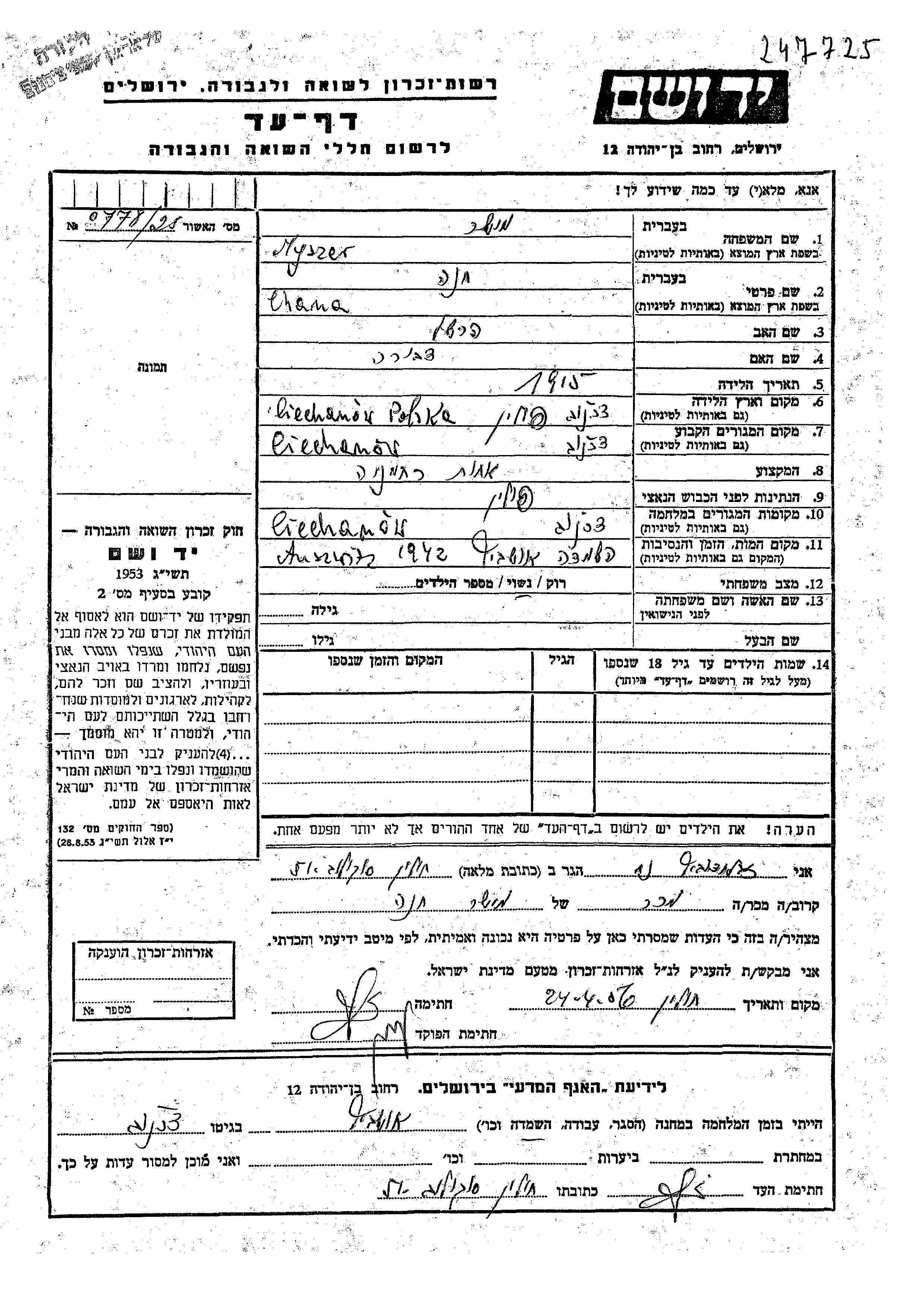 Chana Myszer was born in Ciechanow, Poland, 1915 to Hershel and Dvora. She was a nurse and married. Prior to WWII she lived in Ciechanow, Poland. During the war she was in Ciechanow, Poland. Chana was murdered in the Shoah. Place of death: Auschwitz, Poland, 1942.