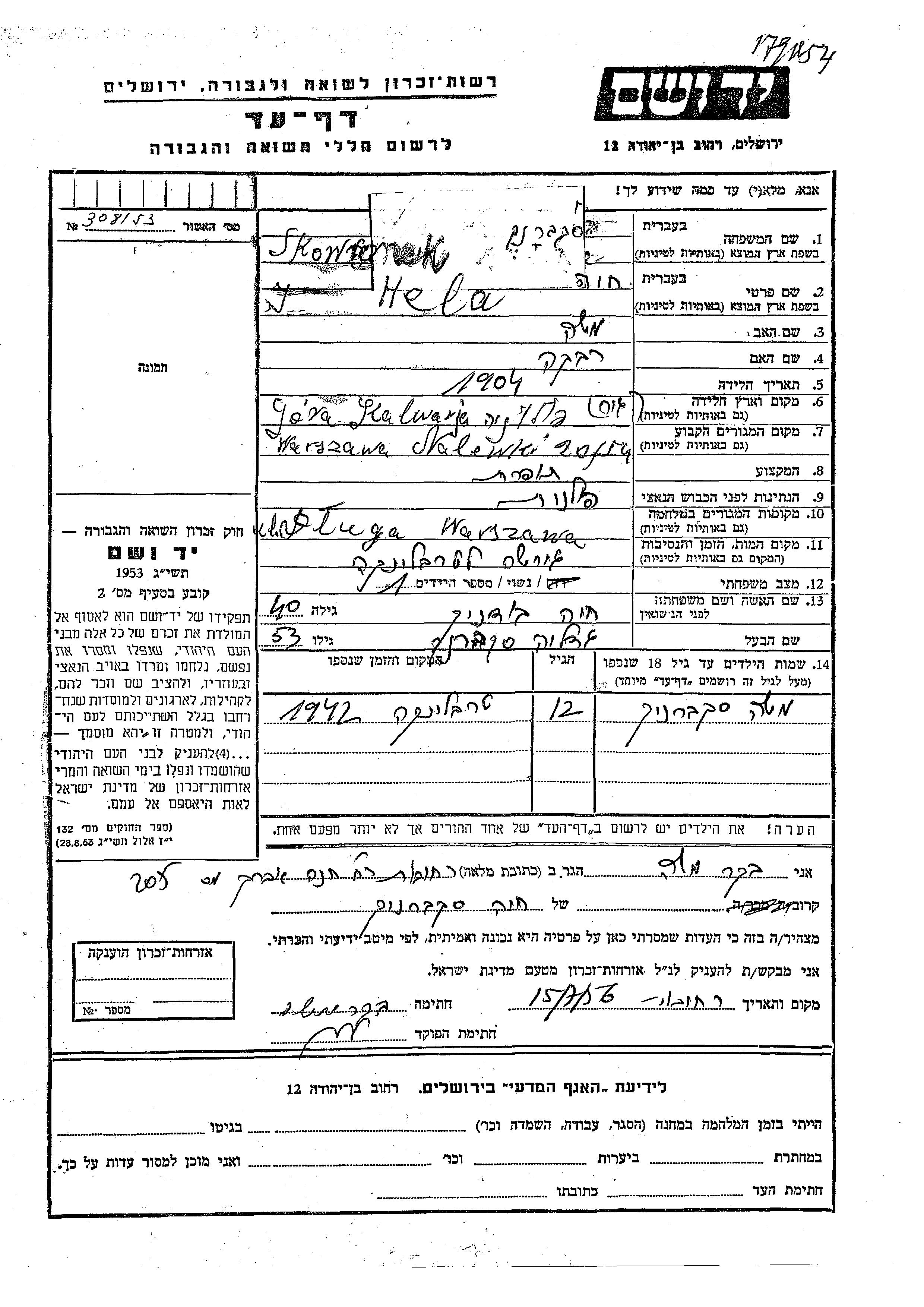 Hela Khaia Skowronek nee Budnik was born in Gora Kalwaria, Poland, 1904 to Moshe and Rivka. She was a seamstress and married to Gedalia. Prior to WWII she lived in Warsaw, Poland. During the war she was in Warszawa, Poland. Hela Khaia was murdered in the Shoah. Place of death: Treblinka, Poland.