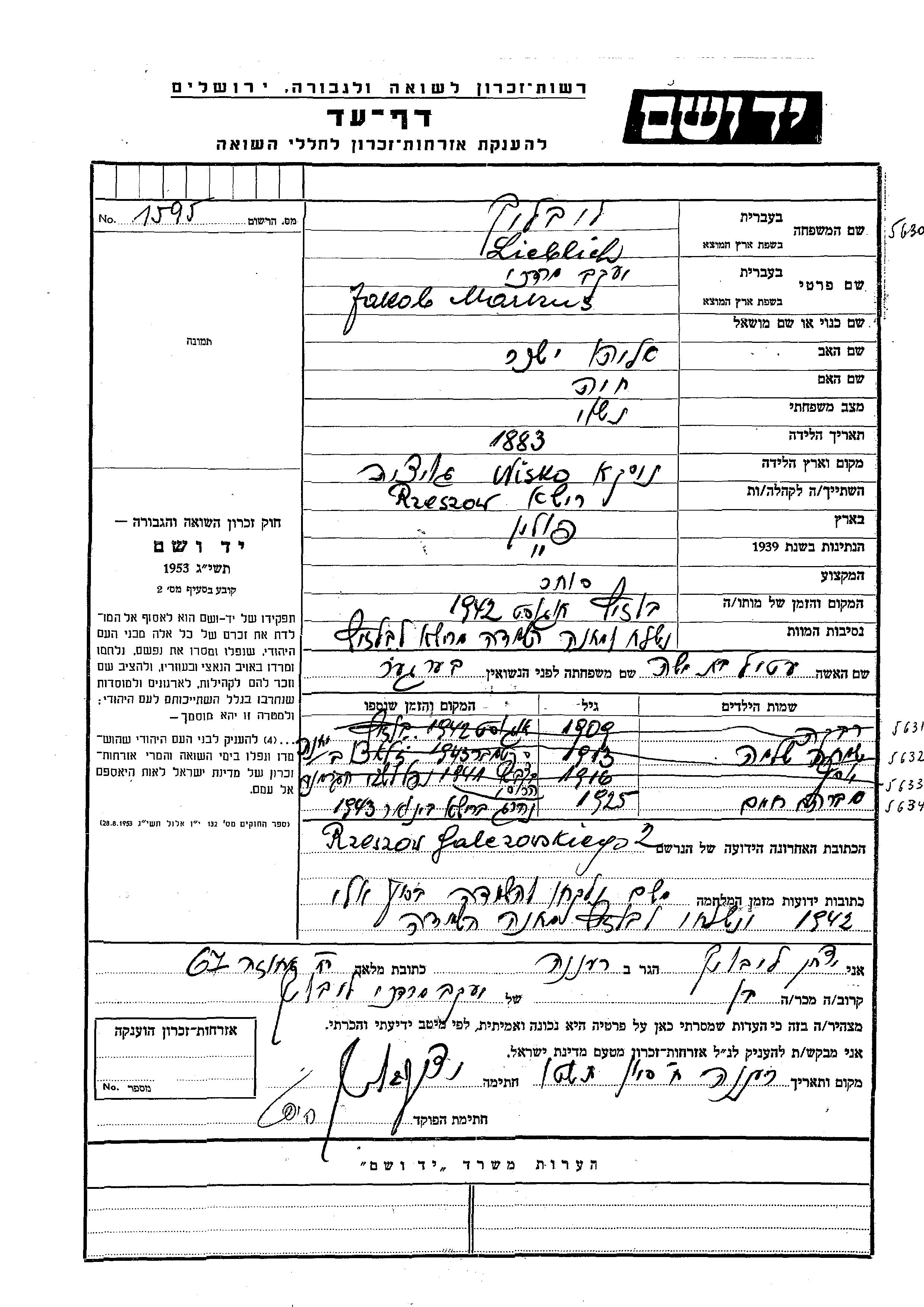 Jakob Mordekhai Markus Lieblich was born in Nisko, Poland, 1883 to Eliahu Isakhar and Khaia. He was a merchant and married to Etil nee Berger. Prior to WWII he lived in Rzeszow, Poland. During the war he was in Rzeszow, Poland. Jakob Mordekhai Markus was murdered in the Shoah. Place of death: Belzec, Poland, 08/1942.