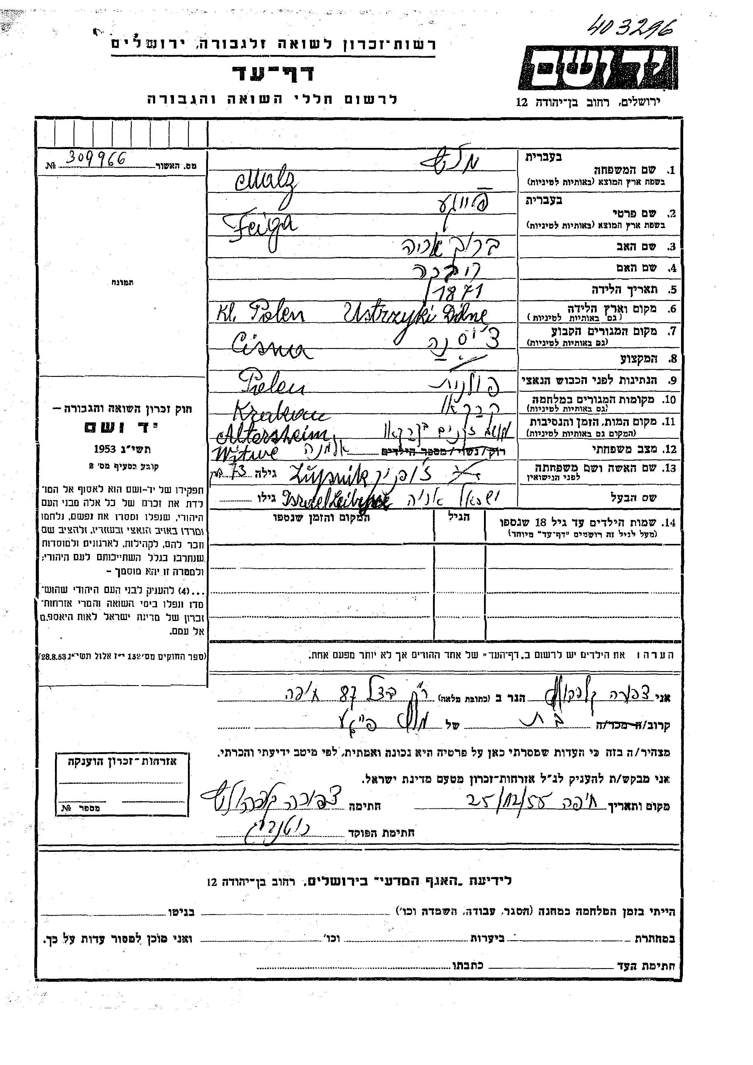 Feige Malz nee Zupnik was born in Ustrzyki Dolne, Poland, 1871 to Barukh Arie and Rivka. She was a widow of Israel Leib Arie. Prior to WWII she lived in Cisna, Poland. During the war she was in Krakow, Poland. Feige was murdered in the Shoah. Place of death: Krakow, Poland.