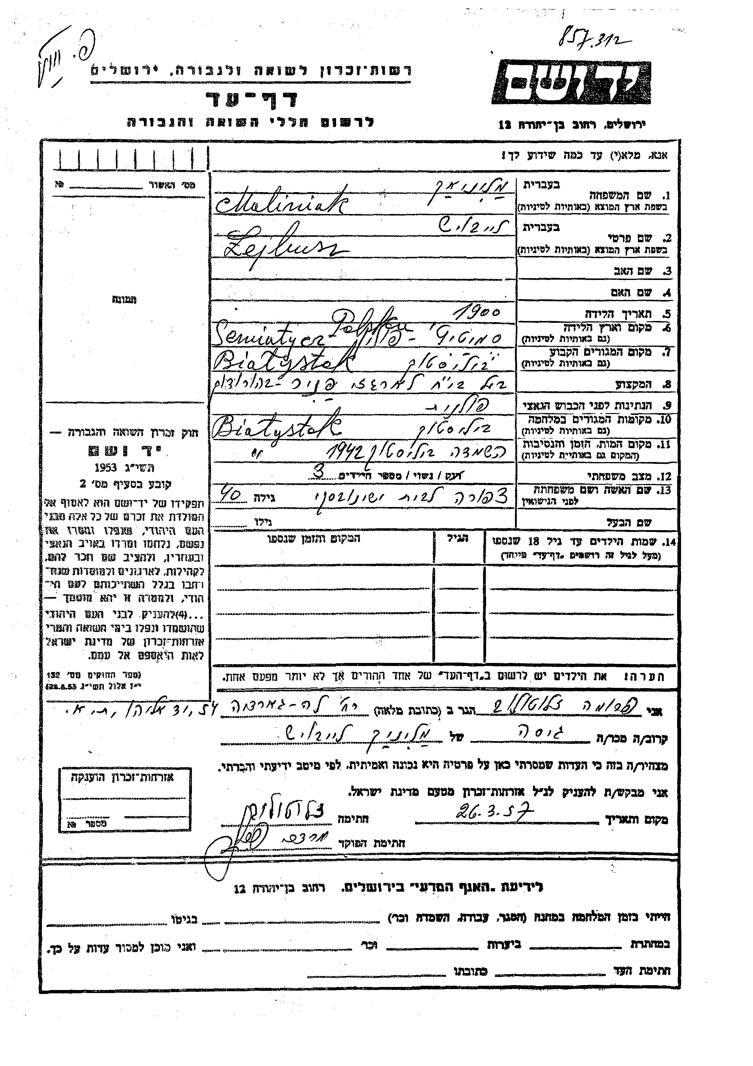 Maliniak Lejbusz 1900 Bialystok, Poland Page of Testimony
