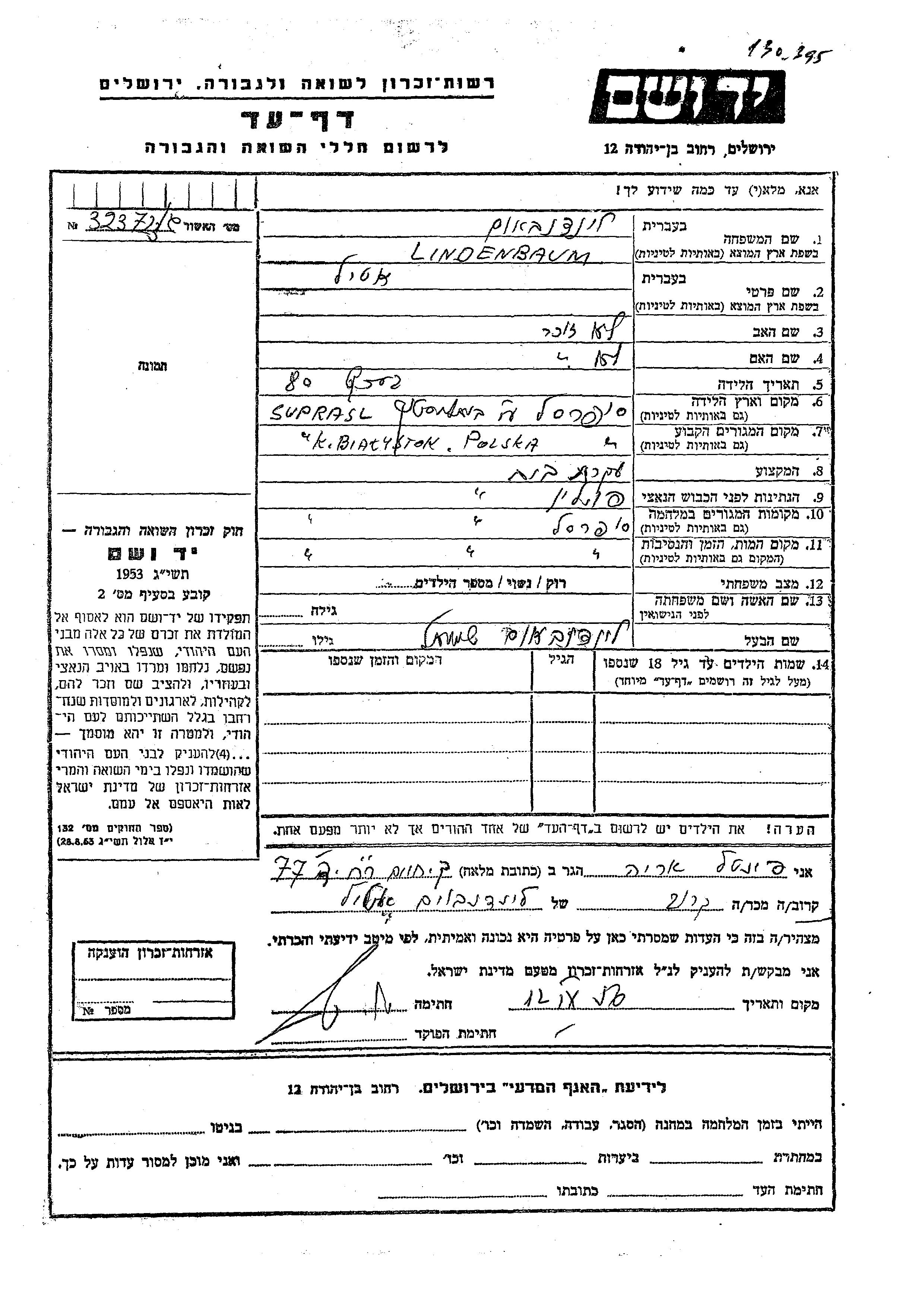 Etil Lindenbaum was born in Suprasl, Poland. She was a housewife and married to Shmuel. Prior to WWII she lived in Suprasl, Poland. During the war she was in Suprasl, Poland. Etil was murdered in the Shoah. Place of death: Suprasl, Poland.