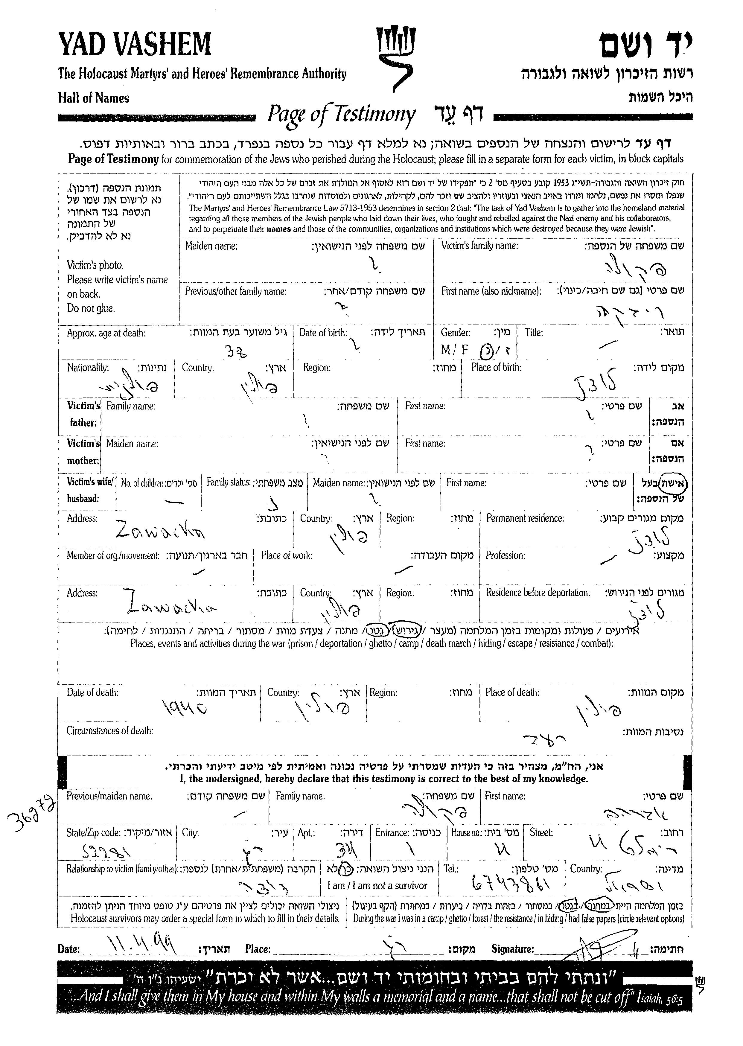 Yad Vashem - Pages of Testimony Names Memorial Collection