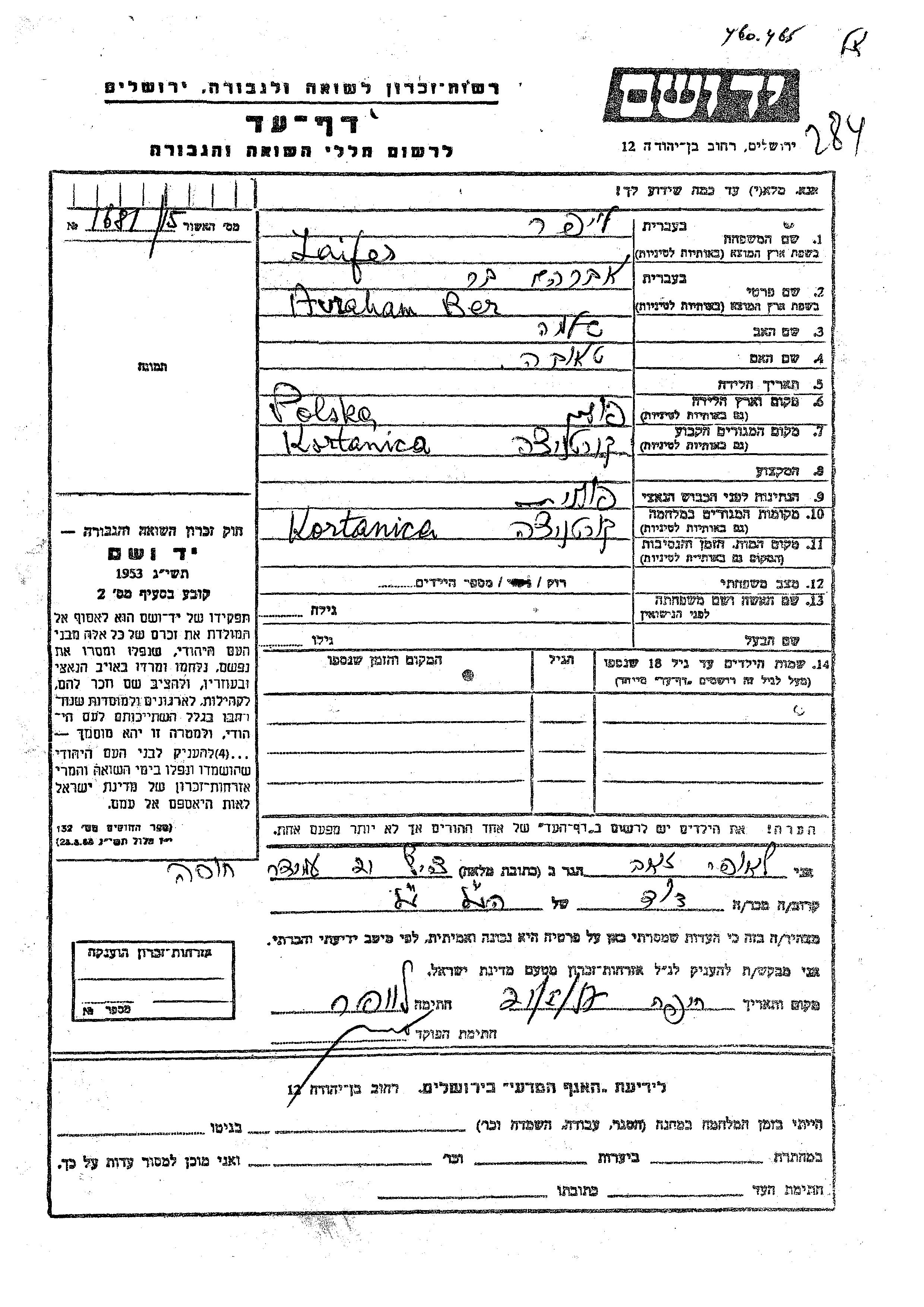 Avraham Ber Laifer was born in Poland to Shlomo and Tauba. He was single. Prior to WWII he lived in Kortanica, Poland. During the war he was in Kortanica, Poland. Avraham Ber was murdered in the Shoah.