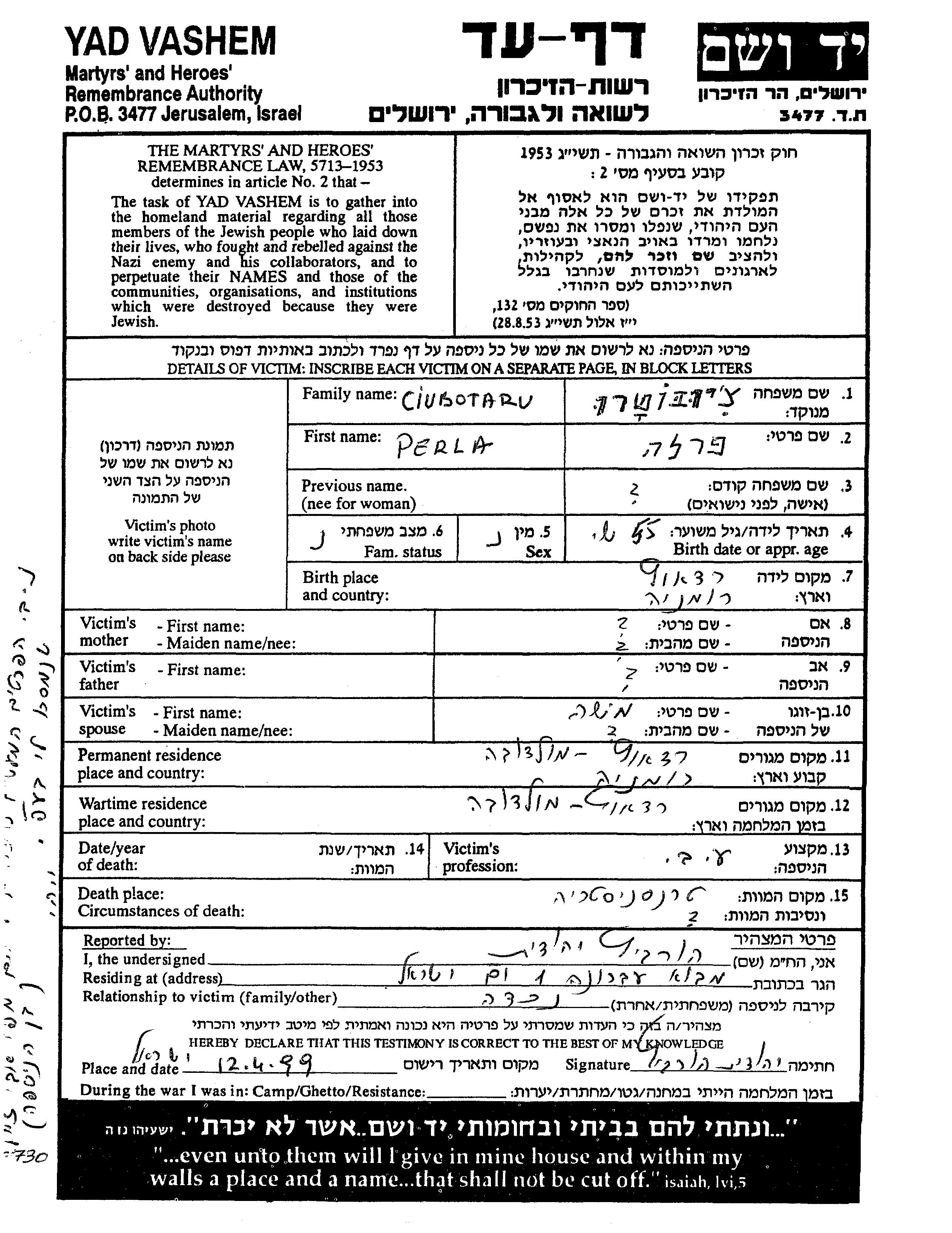 Ciubotaru Perla Radauc, Romania Page of Testimony