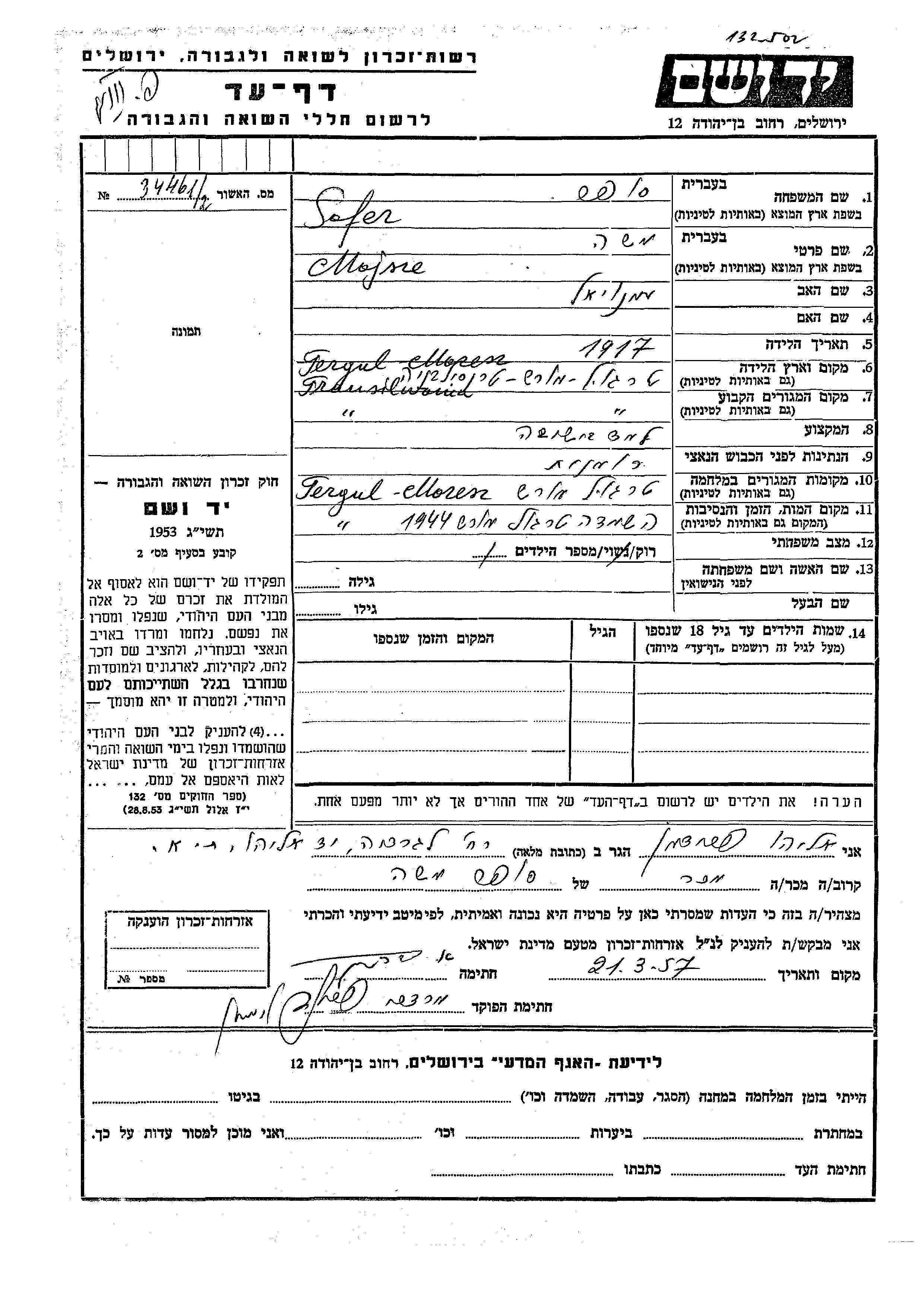 Mojsze Sofer was born in Terg Niarusz, Romania, 1917 to Emanuel. He was a yeshiva student and single. Prior to WWII he lived in Terg Niarusz, Romania. During the war he was in Terg Niarusz, Romania. Mojsze was murdered in the Shoah. Place of death: Terg Niarusz, Romania, 1944.