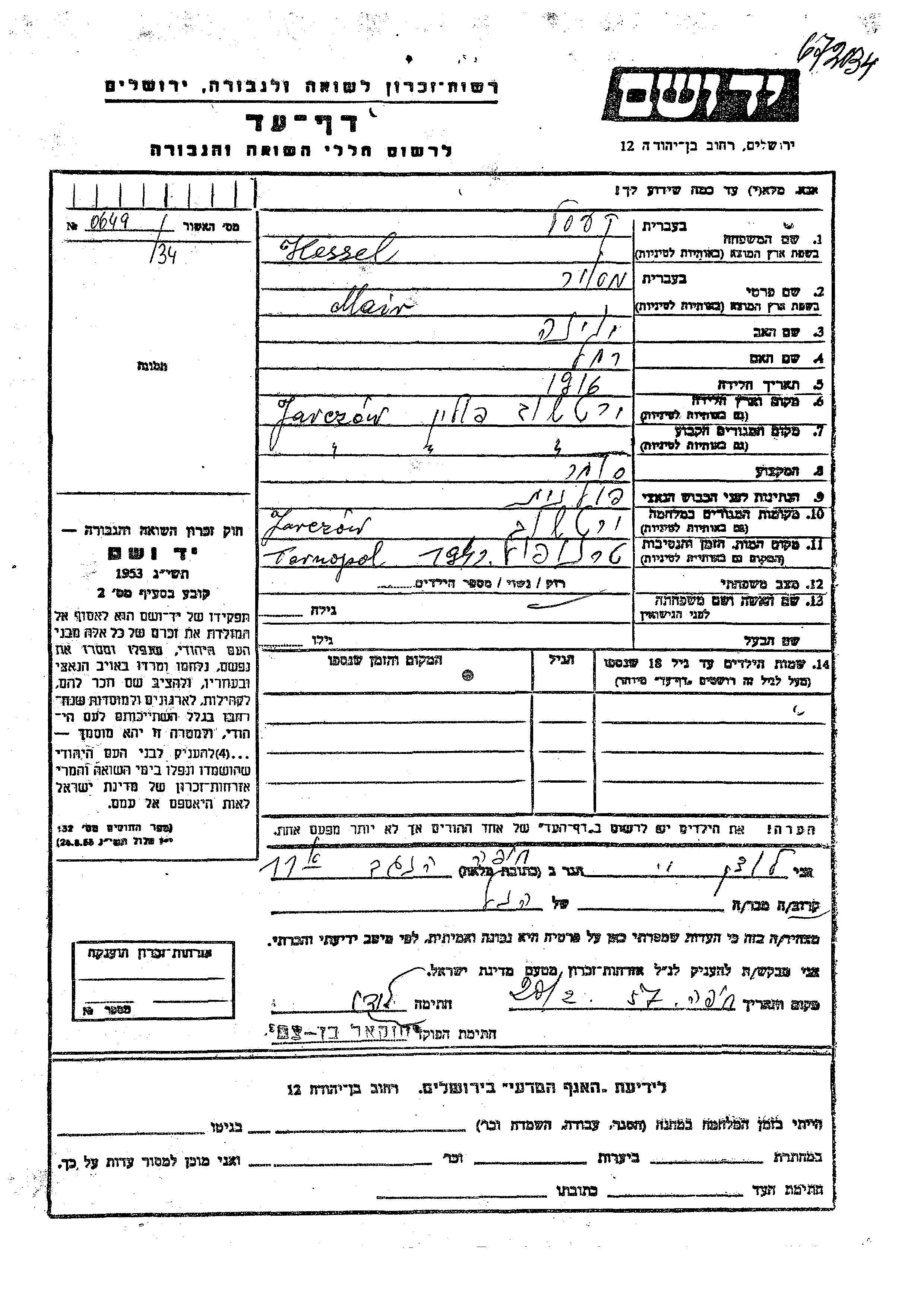 Mair Kessel was born in Jarczow, Poland, 1916 to Yona and Rakhel. He was a merchant and single. Prior to WWII he lived in Jarczow, Poland. During the war he was in Jarczow, Poland. Mair was murdered in the Shoah. Place of death: Tarnopol, Poland, 1942.
