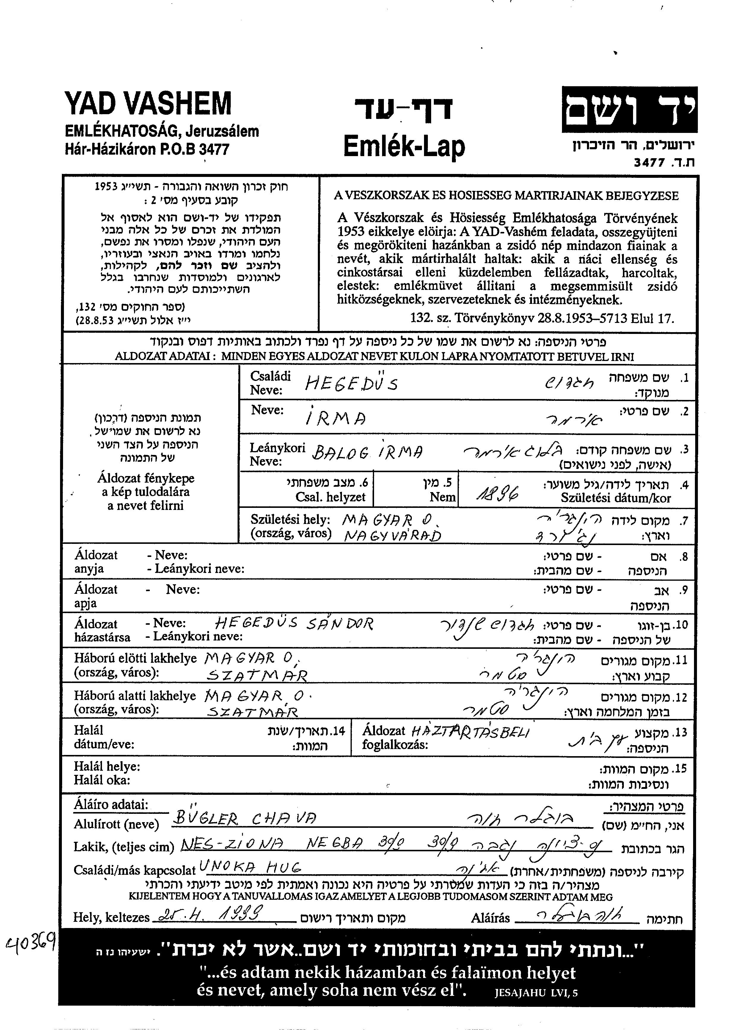 Hegedus Irma 1896 Szatmarnemeti, Romania Page of Testimony