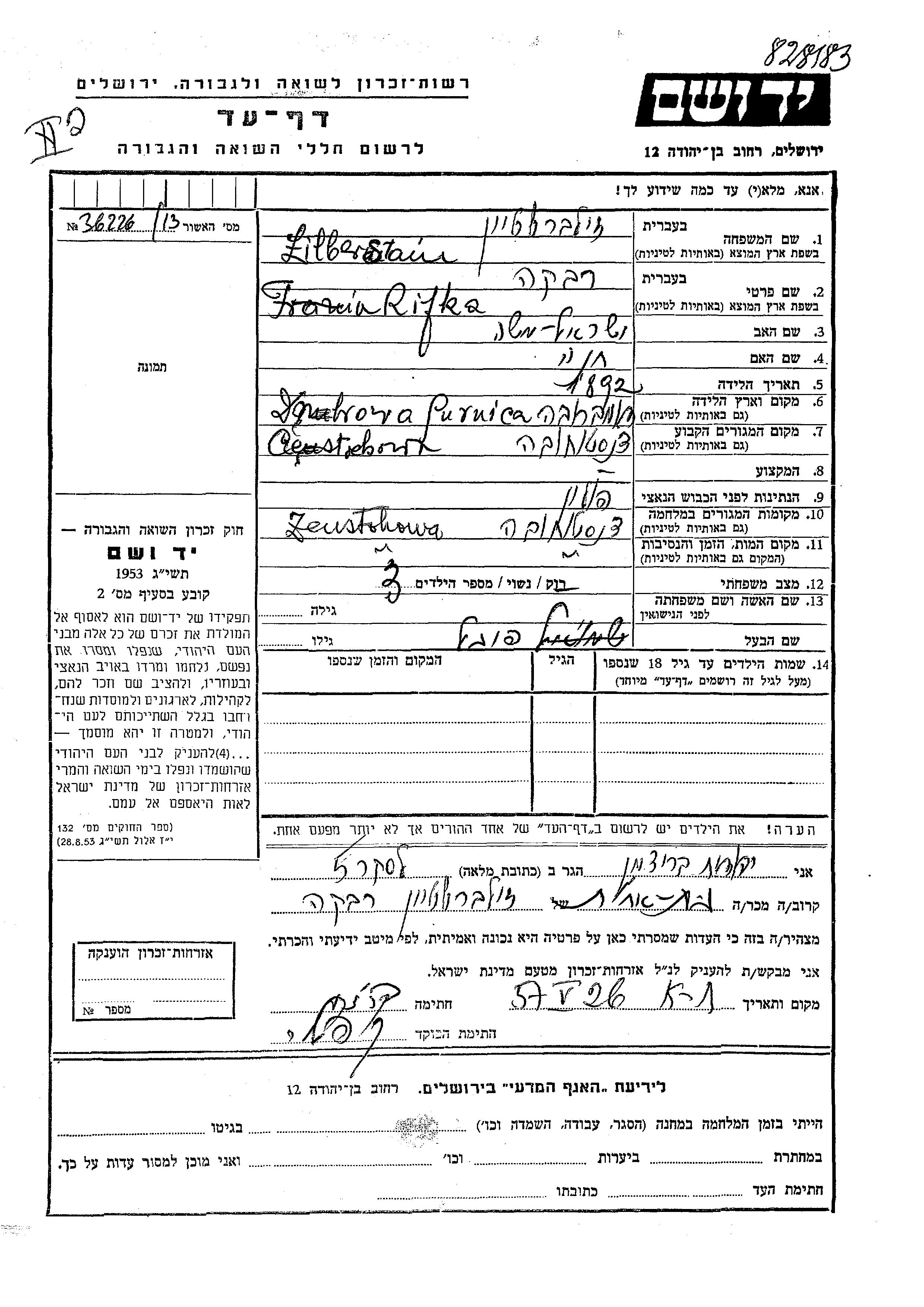 Rifka Zilberstain was born in Dabrowa Gornicza, Poland, 1892 to Yisrael Moshe and Khana. She was married to Feibel. Prior to WWII she lived in Czestochowa, Poland. During the war she was in Czestochowa, Poland. Rifka was murdered in the Shoah.