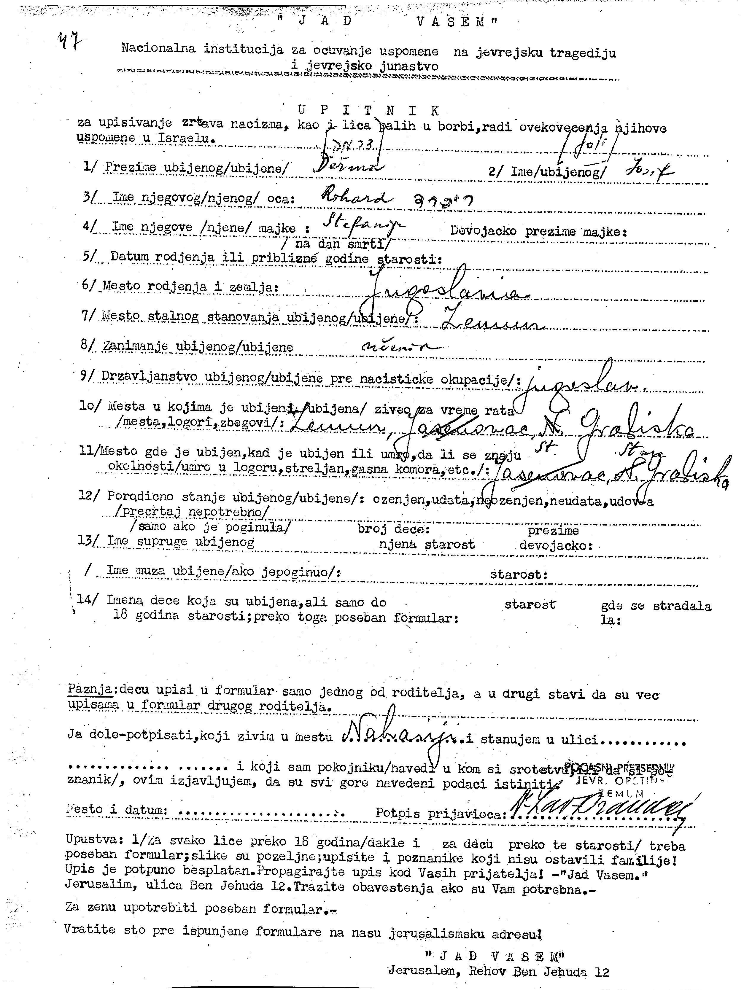 Derma Josif Zemun, Yugoslavia Page of Testimony
