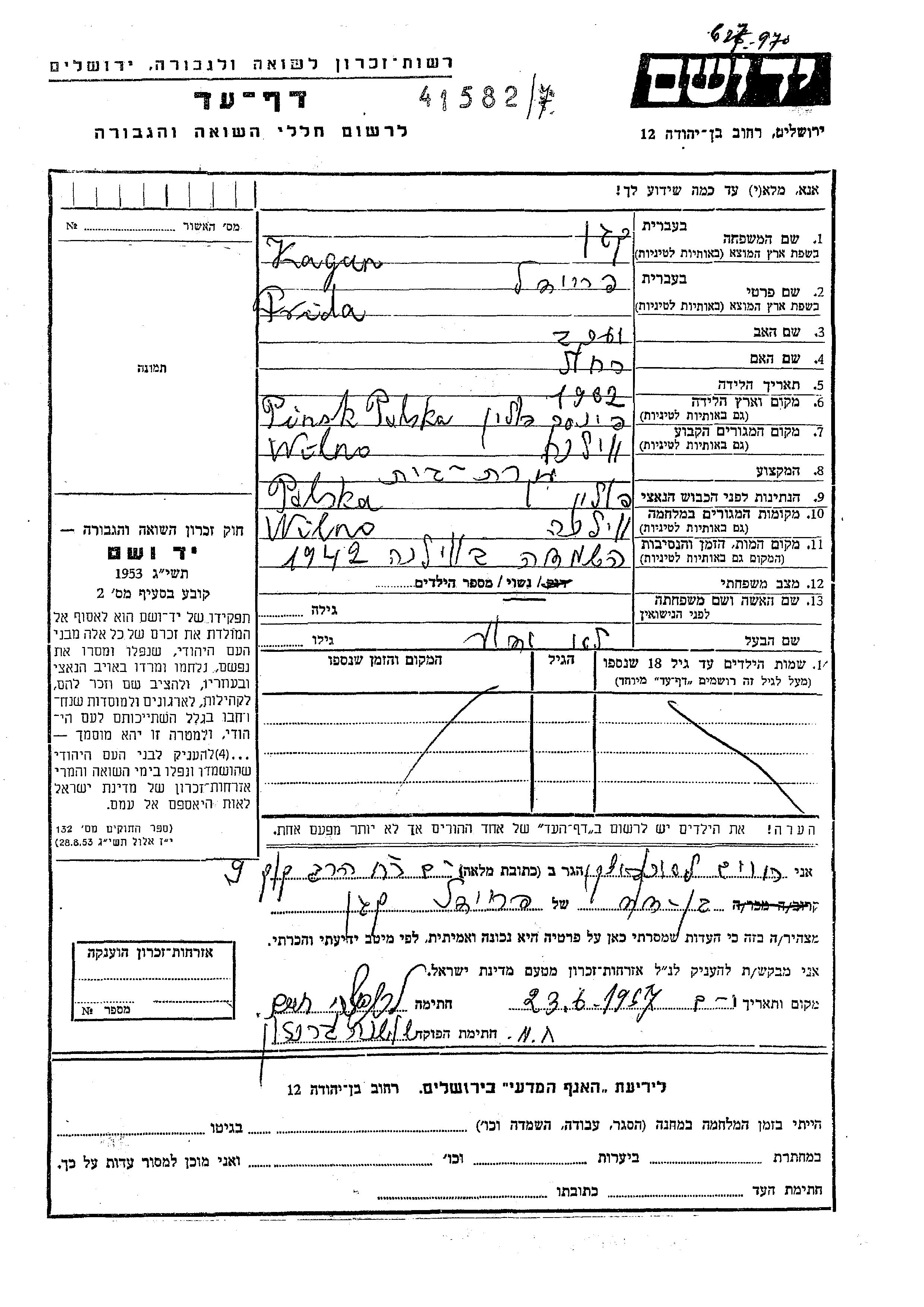 Freidel Kagan was born in Pinsk, Poland, 1902 to Yaakov and Rakhel. She was a housewife and married. Prior to WWII she lived in Wilno, Poland. During the war she was in Wilno, Poland. Freidel was murdered in the Shoah. Place of death: Wilno, Poland, 1942.