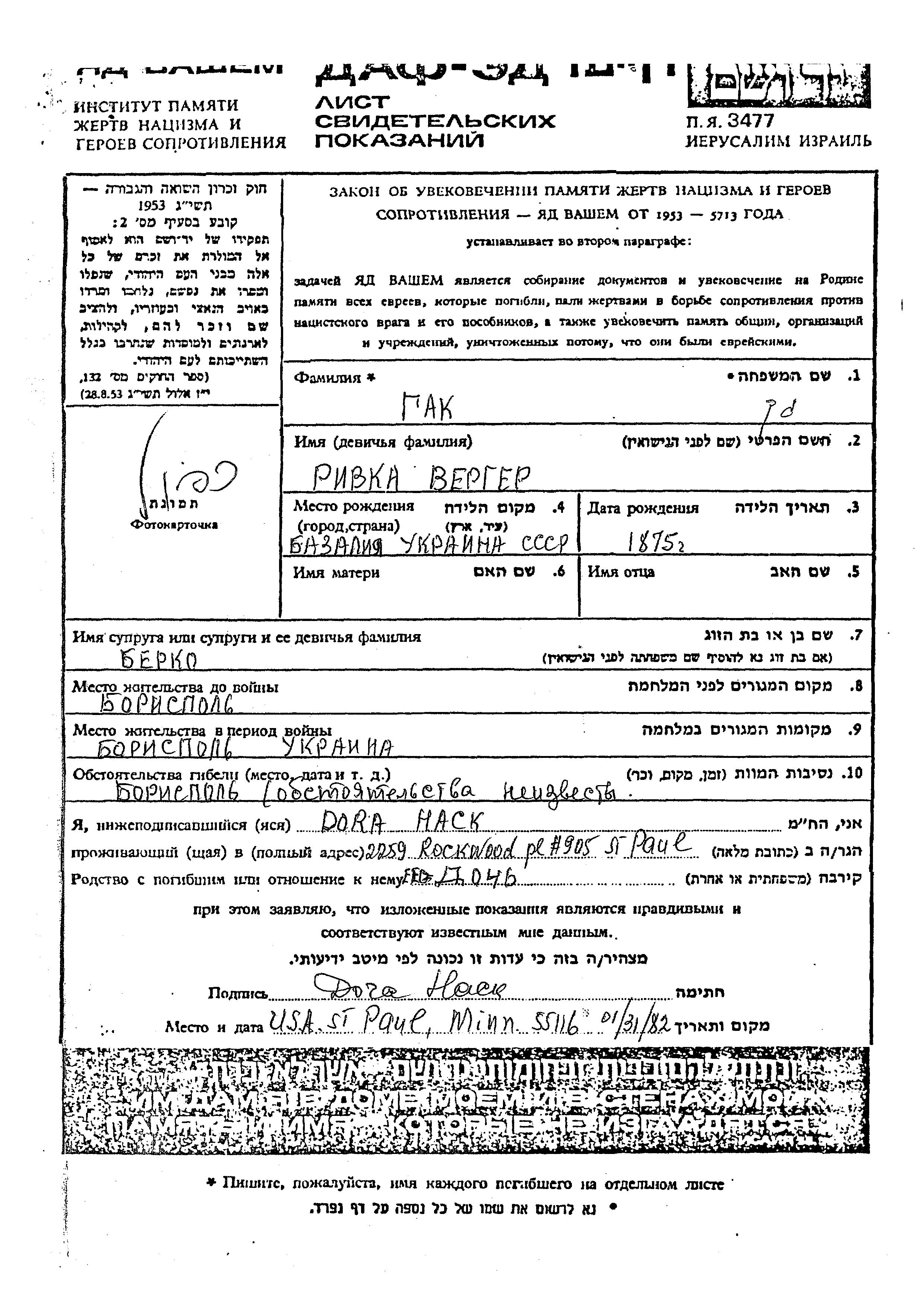 Rivka Gak nee Verger was born in Bazaliya, Ukraine (USSR), 1875. She was married to Berko. Prior to WWII she lived in Borispol, Ukraine (USSR). During the war she was in Borispol, Ukraine (USSR).