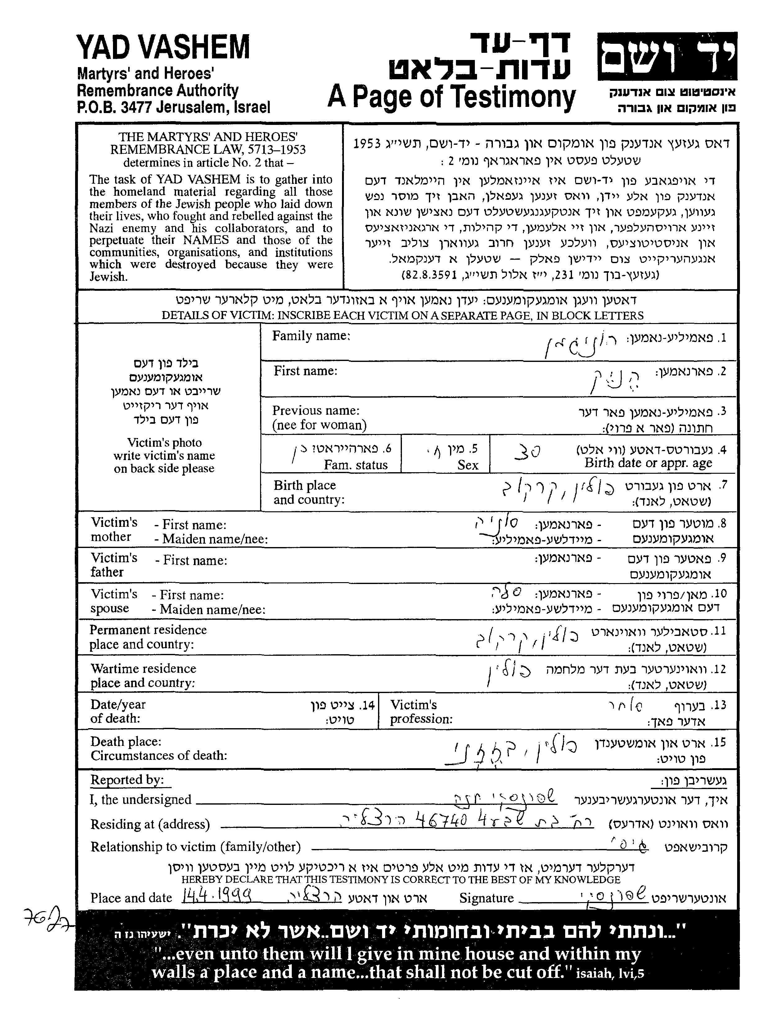 Heniek Honigman was born in Krakow, Poland to Sonia. He was a merchant and married to Sala. Prior to WWII he lived in Krakow, Poland. During the war he was in Poland. Heniek was murdered in the Shoah. Place of death: Brzeżany, Poland.