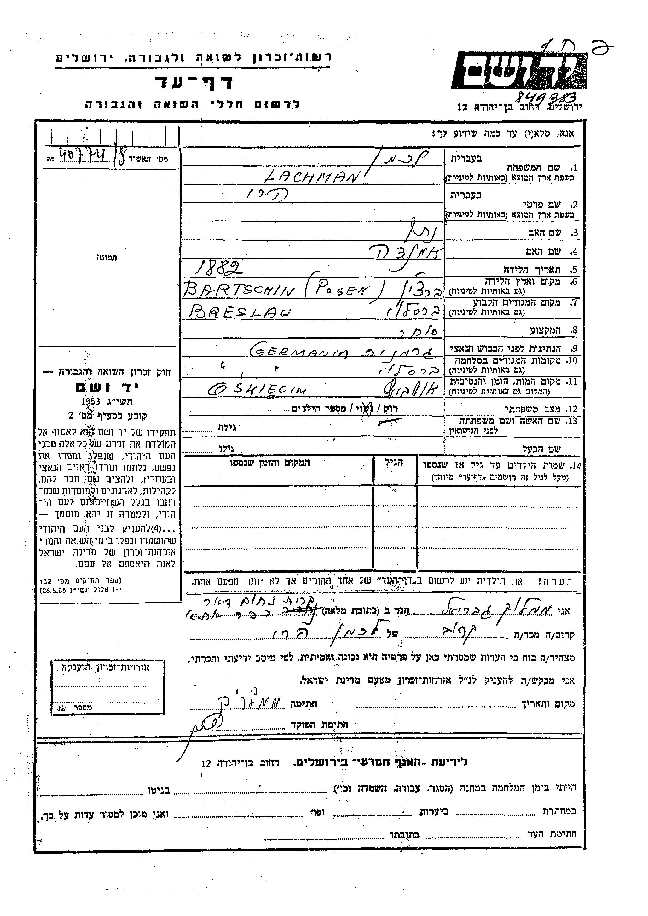 Hari Lachman was born in Bartschin, Poland, 1882 to Natan and Amanda. He was a merchant and single. Prior to WWII he lived in Breslau, Germany. During the war he was in Breslau, Germany. Hari was murdered in the Shoah. Place of death: Auschwitz, Poland.